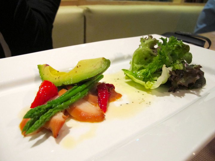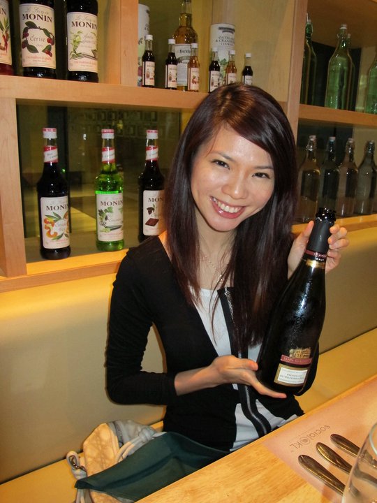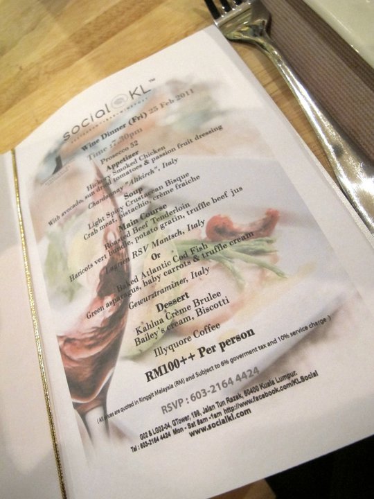 After sitting through a 2 hour jam just to get from Mid Valley to G Tower the first thing I wanted was an ice-cold beer. Good thing they had fresh Starker Lager at Social@KL's bar downstairsOooh! The menu sounds tempting!Prosecco 52 - essentially sparkling wine from Italy (sparkling wine made outside Champagne cannot be called champagne)Mei Sze who got stuck in the LRT (literally) on the way over with the bottle of ProseccoChardonnay "Altkirch" also from Italy. Very easy drink and not too dry, this went well with our appetizerappetizer - Hickory Smoked Chicken with avocado, sun-dried tomatoes and passion fruit dressing. Ok I was starving so this didn't stay on my plate for long. The smoky taste of the chicken was well-balanced our by the tomatoes and the fruity dressing as well as the Chardonnay.Next it was a Light Spicy Crustacean Bisque which consisted of crab meat, pistachio and creme fraiche (a delicious, thin form of sour cream). Nice!For my main I decided to order the Roasted Beef Tenderloin which was served with haricots vert bundle (green beans tied together), potato gratin and truffle beef jus. Now I loved this. Tender tender beef coupled with my favourite potato dish - gratin! This was paired with Lagrien RSV Mantsch from Italy which was a red wine. It's earthy flavours complemented the beef well.Mei Sze went for the Baked Atlantic Cod Fish with green asparagus, baby carrots and truffle cream. This was paired with the Gewurztramine also from Italy. White wine with white meat some say. However there is some truth to that because the flavours in white wine often complements white meat. But hey if you're feeling adventurers do experiment with other wines.Kahlua Creme Brulee served with Bailey's cream and biscotti. Absolutely lovely! Washed down with a cup of Illyquore coffee.April enjoying her dessert.Last pic of the night...