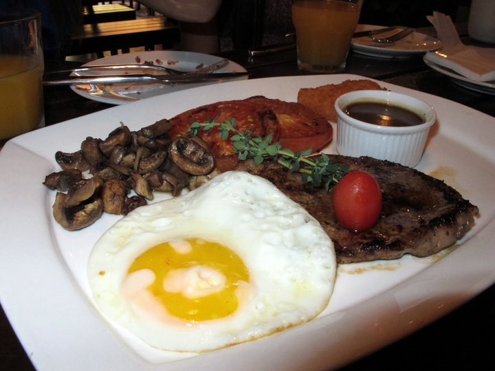 Steak and Eggs Breakie [RM 25] – Tender grain fed ribeye steak with sunny side up, hash brown, saute’ mushrooms, grilled tomatoes and beefy brown gravy – Heaven for meat lovers like me!