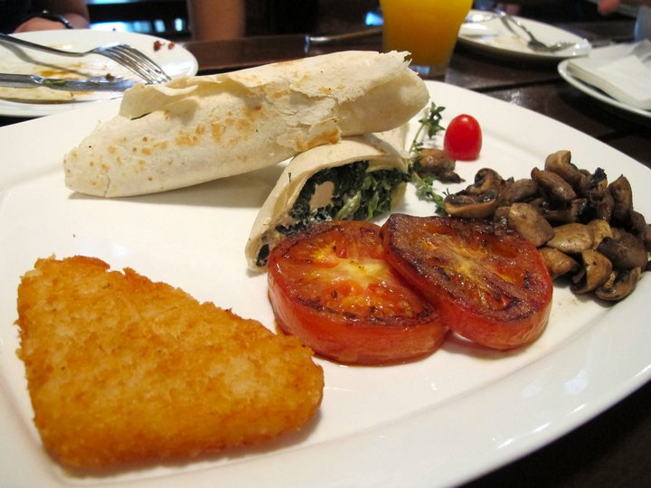 The Spanish Wrap [RM 19] – one for vegetarians – Spinach with cheddar cheese wrapped in burrito, served with saute’ mushrooms, grilled tomatoes and hash brown