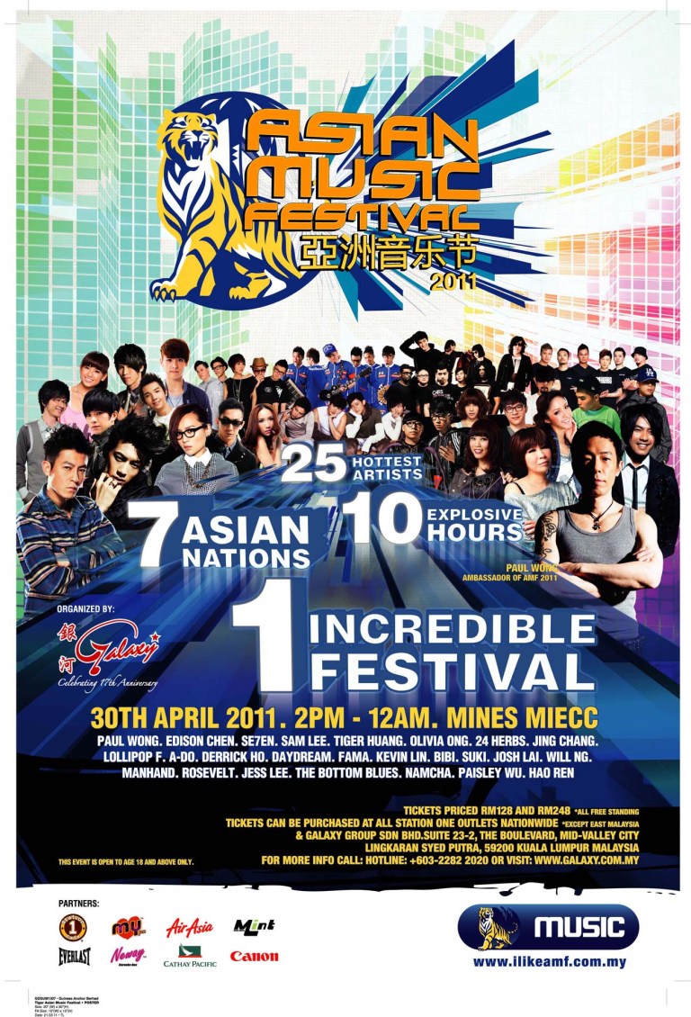 The Asian Music Festival™ will be ignited at 2pm at The Mines International Exhibition & Convention Centre (MIECC), Sri Kembangan this April 30th 2011. The additional 10 performers from international and local music scenes include Lollipop F, Kevin Lin and Derrick Ho from Taiwan, 24 Herbs and Sam Lee aka DJ Becareful from Hong Kong, A-Do from Singapore, The Bottom Blues from Thailand, and our very own Jess Lee, Manhand and Rosevelt from Malaysia.