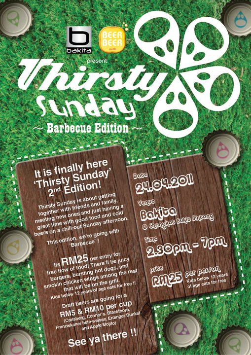 24 April 2011 – The inter-monsoon afternoon downpour failed to deter patrons or dampen spirits at 2nd edition of Thirsty Sunday at bakita, Jalan Berangan, Kuala Lumpur. Billed as the BBQ edition, guests were treated to a BBQ food buffet for a cover charge of RM25 while glasses of Carlsberg and Connors went for just RM5 each!