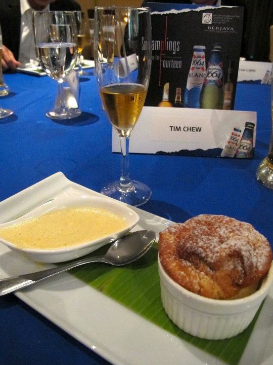 Stephanie has this one - Roasted Medallion of Australian Venison Loin. Now I can't tell you what this tastes like but Stephanie looked like she was enjoying itThis was mine! I just love a good steak and this Grilled American Prime Beef Tenderloin was simply sublime! Cooked medium rare to preserve the taste and to keep the meat tender (just look at the lovely pink centre!) this dish and Stephanie's venison were both subtly infused and paired with the......Kronenbourg 1664 lager!!! My fav!!!The dessert was the Hot Corossol Souffle which was served with the very expensive Inniskillin ice wine. Now call me spoilt but ice wine is the only type of wine I drink and this has to be one of the best that I've ever tasted! Dry, sweet and fruity...simply awesome and lent it's sweetness to the dessert.Throughout the night I was also drinking Asahi! Super dry and super refreshing!Cafe Amarula - Coffee with Amarula ice cream! Lovely! Btw Amarula Cream is from South Africa and is made from the Marula fruit. Even animals like it! Check out the video below hahaha!