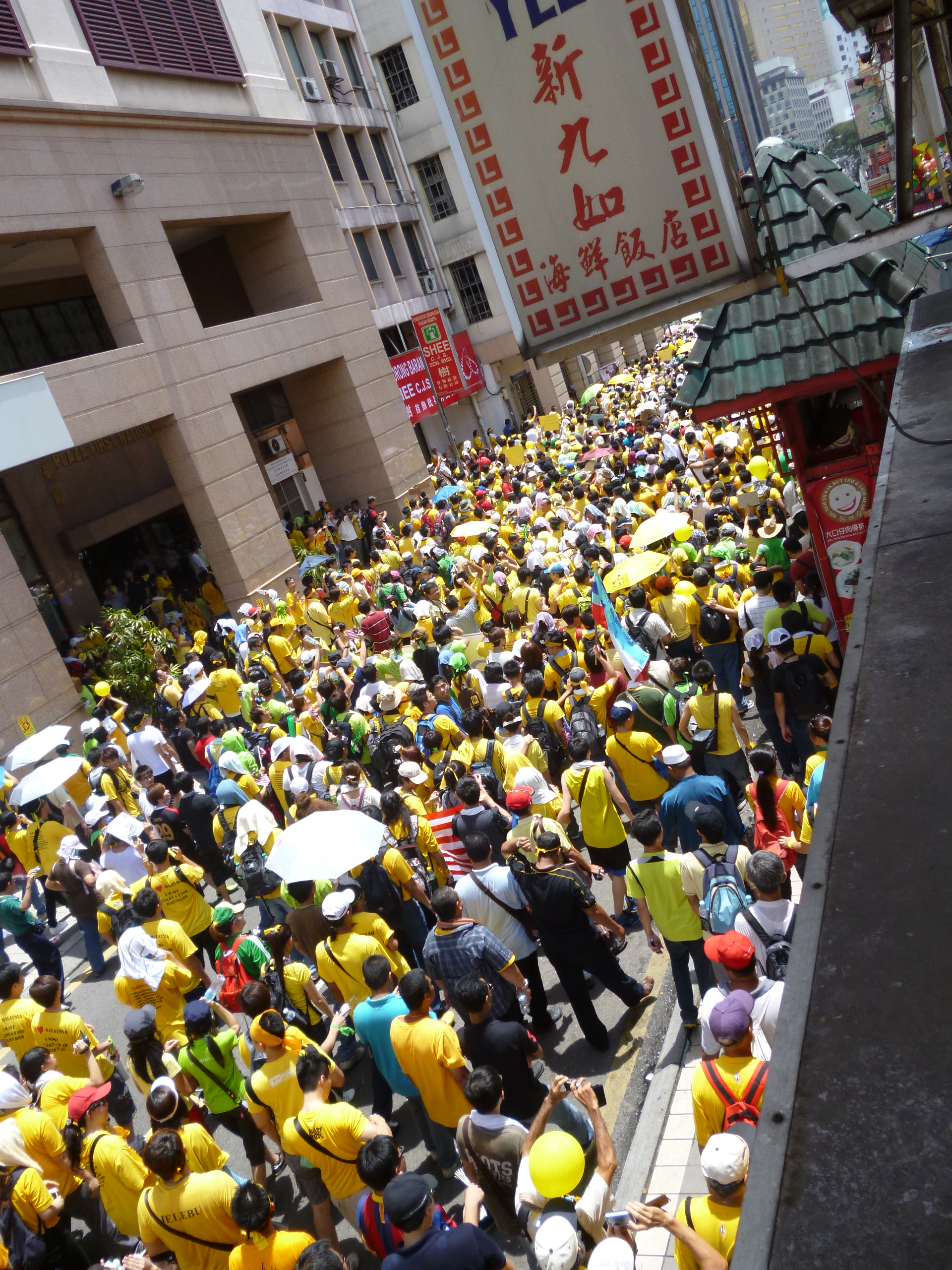 The whole street was yellow and green as you can see from the video below. There were people of all races and ages there. Yes and I mean that literally! The atmosphere was like a carnival. People were good natured and jovial and shouts of “Bersih! Bersih!” rang out every now and then. There were also yellow Angry Birds and a giant beach ball being thrown around.