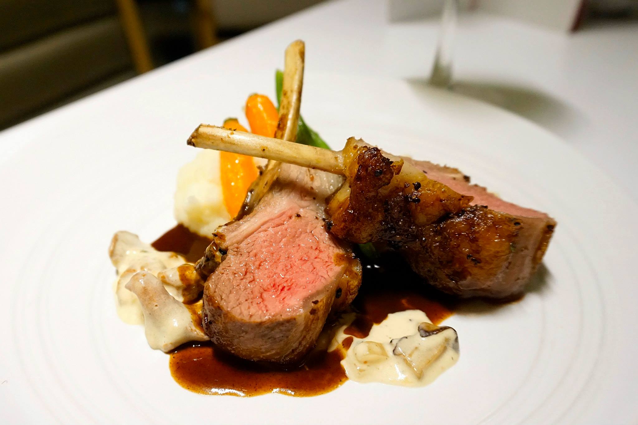 Grilled lamb chop served with Haricot vert, puree of pomme & truffle essence enhanced with fricassee Chanterelle sauce