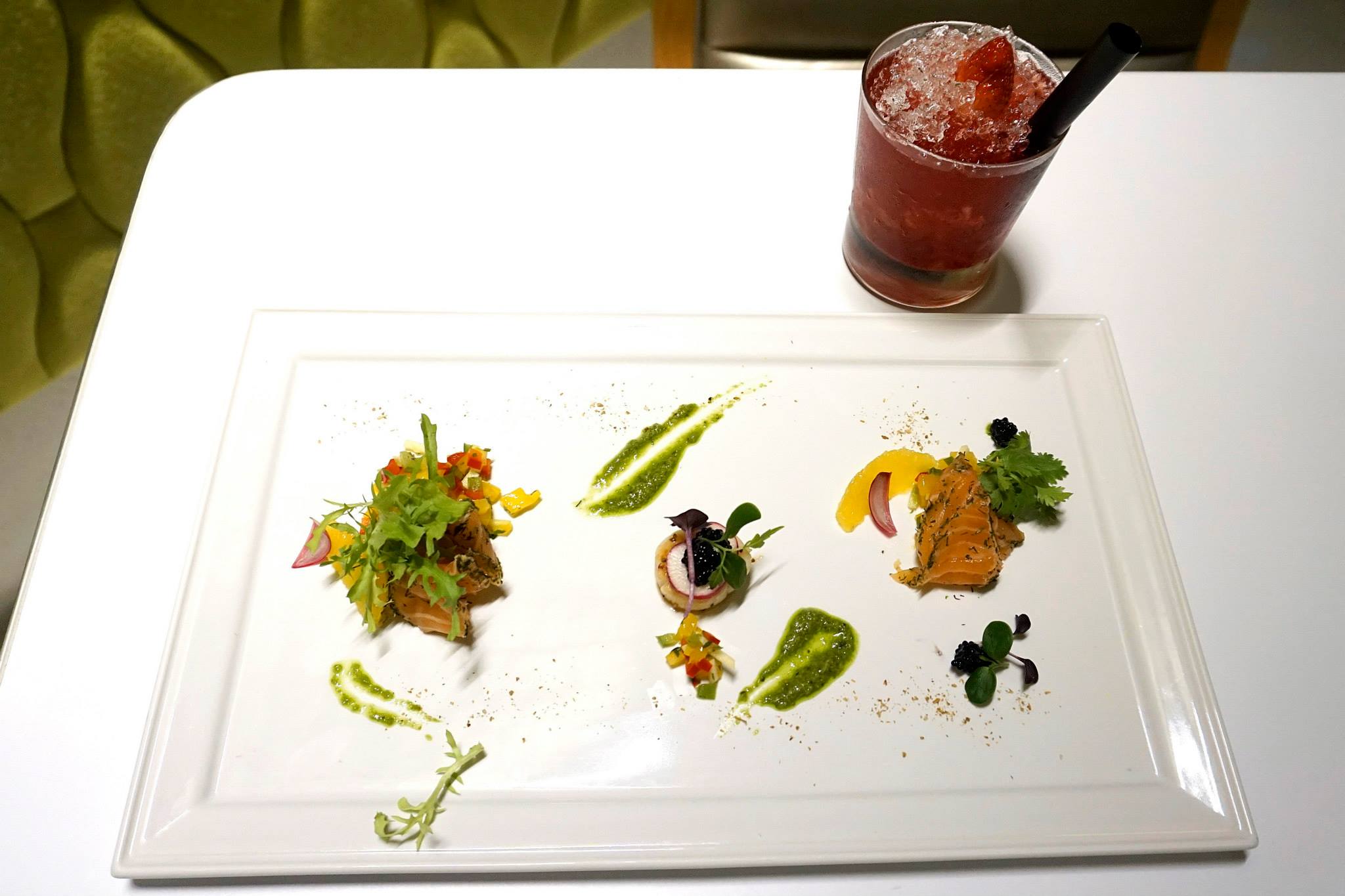 Pan seared scallop accompanied with salmon gravlax & pickled shallot served with mango salsa, citrus bite & ginger scallion pesto