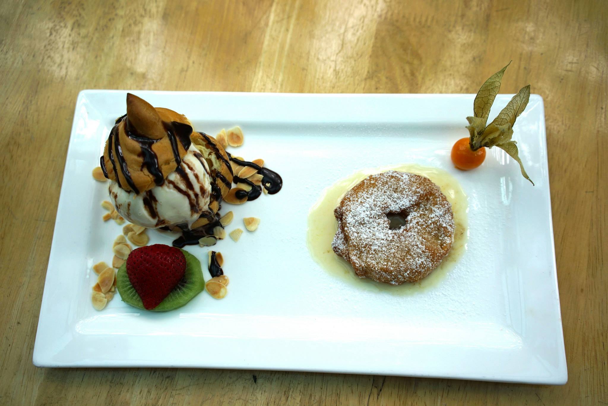 Chocolate profiterole with vanilla ice-cream and cinnamon sugared apple fritter on vanilla sauce. I must say that it’s pretty darn good even though I’m not much of a dessert person!