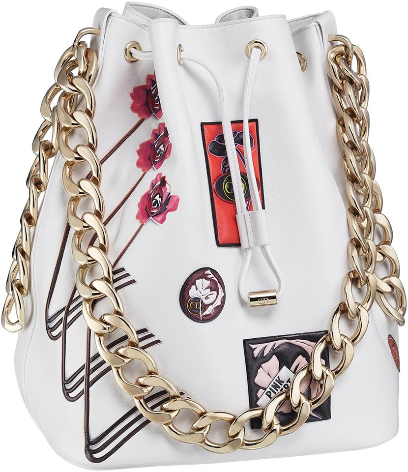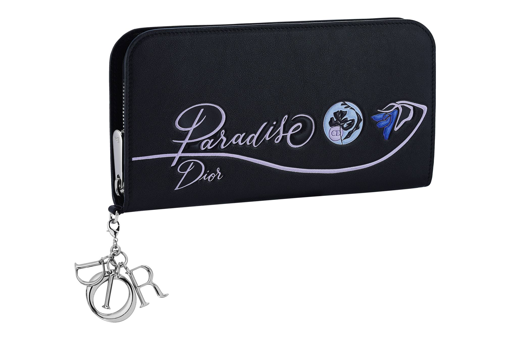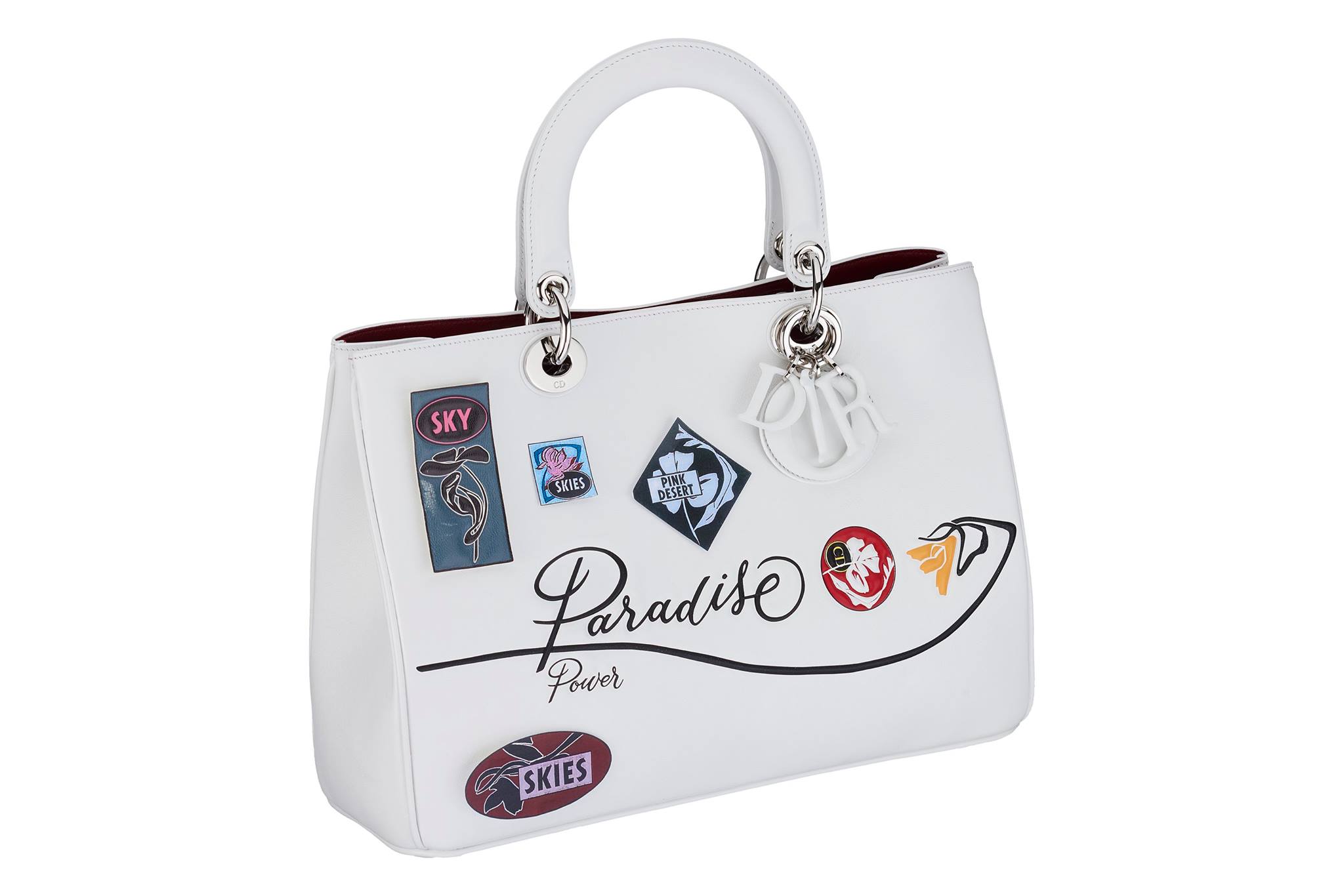 The new Dior Paradise collection features a range of bags and small leather goods which are boldly coloured and playfully adorned with large urban flowers, utopian phrases and skateboard inspired badges.