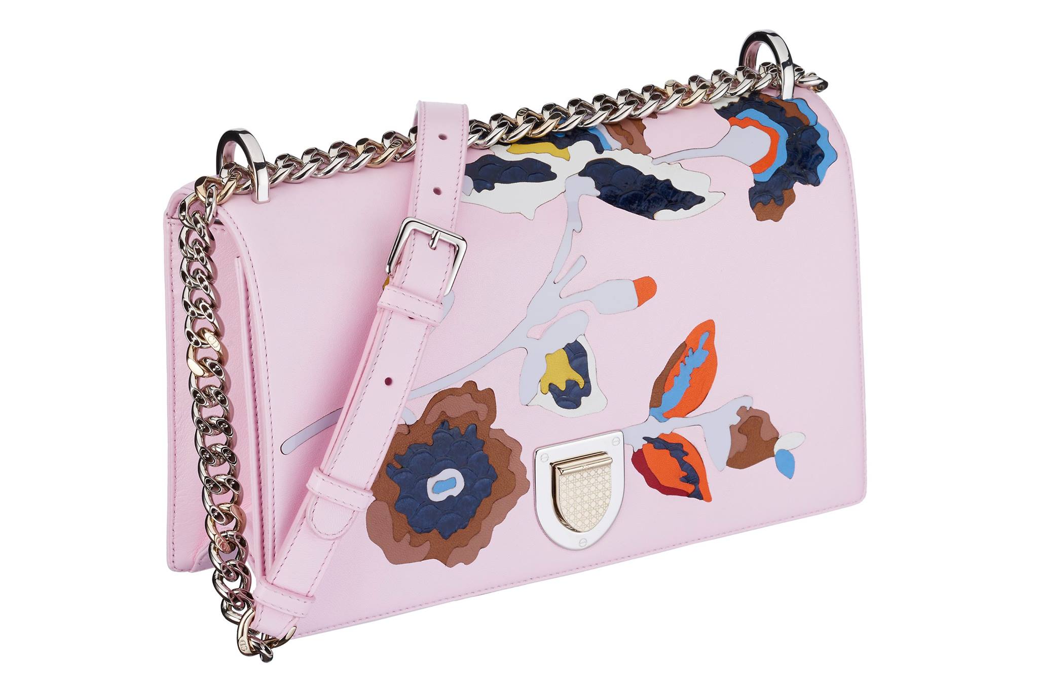 화이트 파라다이스 카프스킨 소재의 레이디디올 백, 엠보싱 레더 소재의 배지와 플라워 장식, 라지 스트랩.