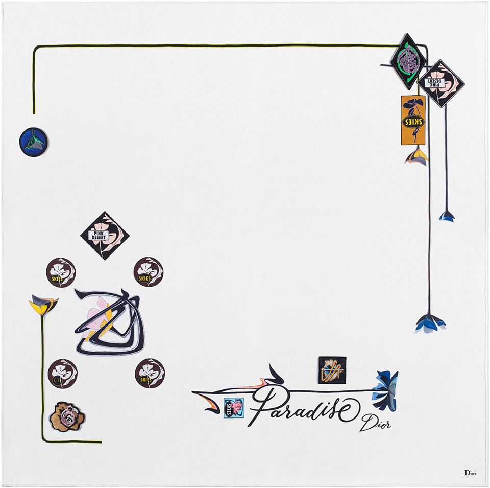 Carré en twill de soie, inscription Paradise Dior, bords roulottés main 90x90cm.