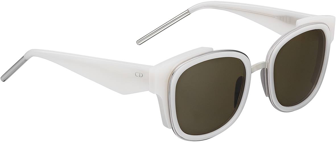 2016 크루즈 컬렉션의 ‘VeriDior2N’ 선글라스. 오팔 아이보리 아세테이트와 실버 메탈 소재의 구조적인 스퀘어 셰잎. 실버 메탈 엔딥의 그래픽 템플, 카키 렌즈.
