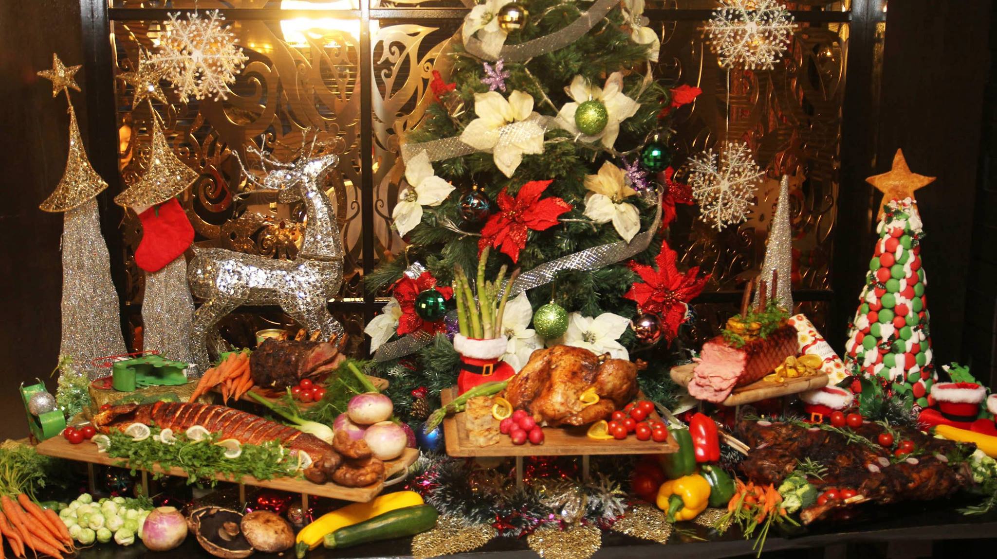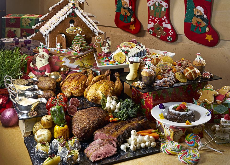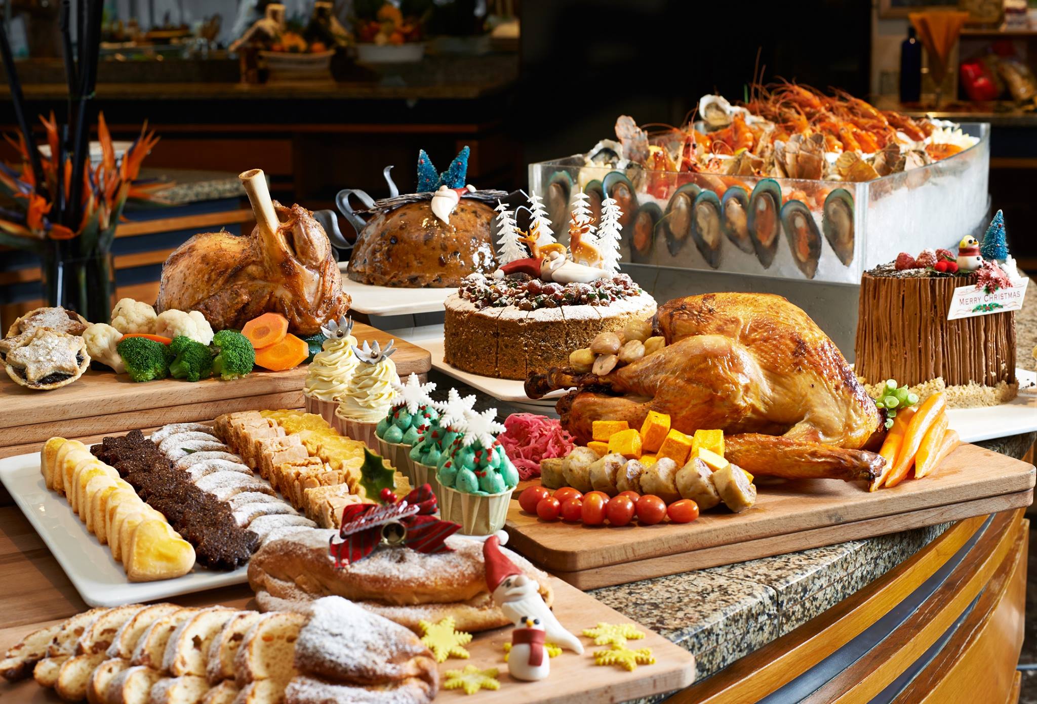 International and local selection with Christmas goodies in a buffet spread.