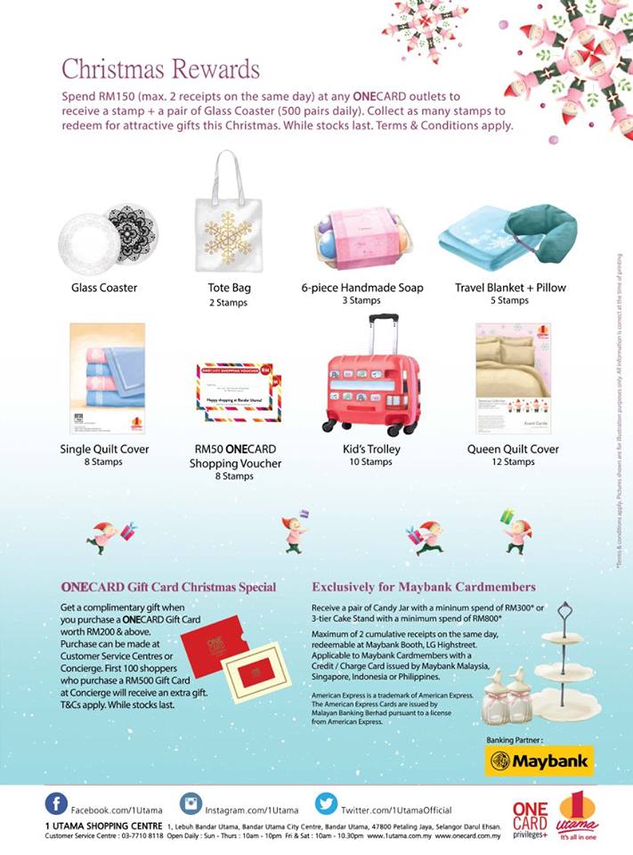 (i) Pick up a Christmas redemption card and collect as many stamps as possible to redeem exclusive tiered 1 Utama Christmas gifts like snowflake tote bag, 6-piece soap set, travel blanket and pillow set, quilt covers, kid’s trolley and ONECARD shopping vouchers at Ground Floor Highstreet opposite the Customer Service Centre. Just spend RM150 (max combination of 2 receipts on the same day) at any ONECARD outlet to receive one stamp and a pair of Glass Coasters, limited to 500 pairs daily, other gifts whilst stocks last.