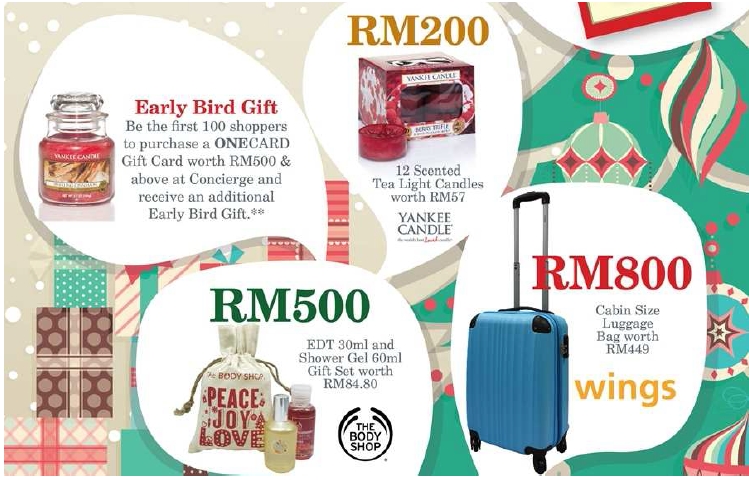 ‘Tis the season for giving’ – Purchase a ONECARD Gift Card valued at either RM200, RM500 or RM800 and receive a free gift at the Customer Service Centres or Concierge. Limited to 5 items per day (jar candle limited to 1 unit), early bird promotion is only applicable for purchases at Concierge, 3rd Floor Highstreet, whilst stocks last.