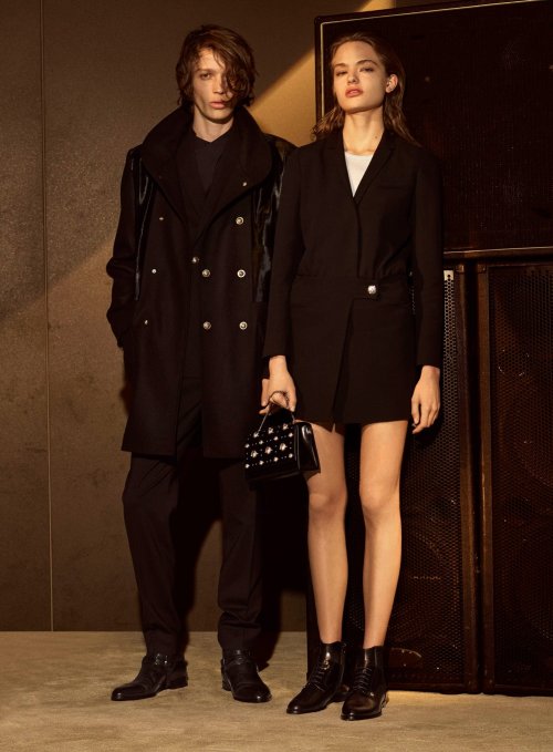 Everything in the collection depicts attitude, especially the fur-trimmed parka, or the men’s blouson with a fur collar. The shirt is the new city essential, like the women’s black shirt with epaulettes, or the men’s camo shirt, always with a covered placket. There’s tomboy toughness to women’s pieces like the pinafore body miniskirt or the loose fit jeans, especially when worn with flat ankle boots.