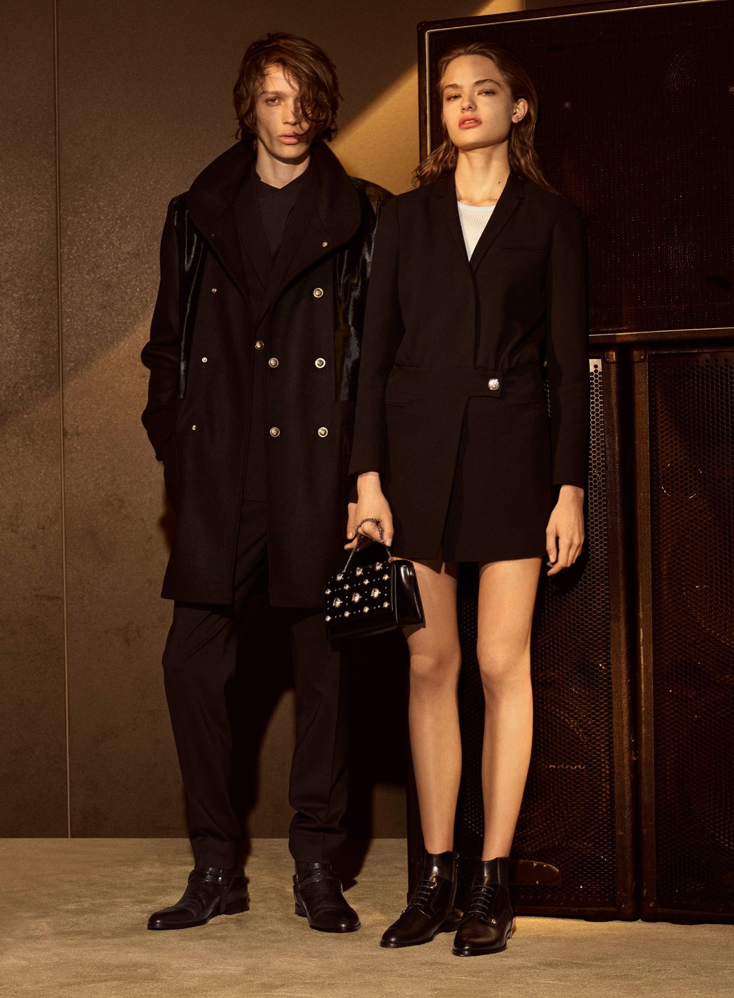 Trench coats, zip-up bombers, double-breasted coats and cargo pants define the season for both women and men. Camouflage prints are reborn with the head of the Versus Versace lion, while paisley prints bring softness and leopard prints have rock energy. Mini skirts in either print or pleated with the Versus Versace lion hardware, are daring, a playful contrast when worn with utilitarian coats.