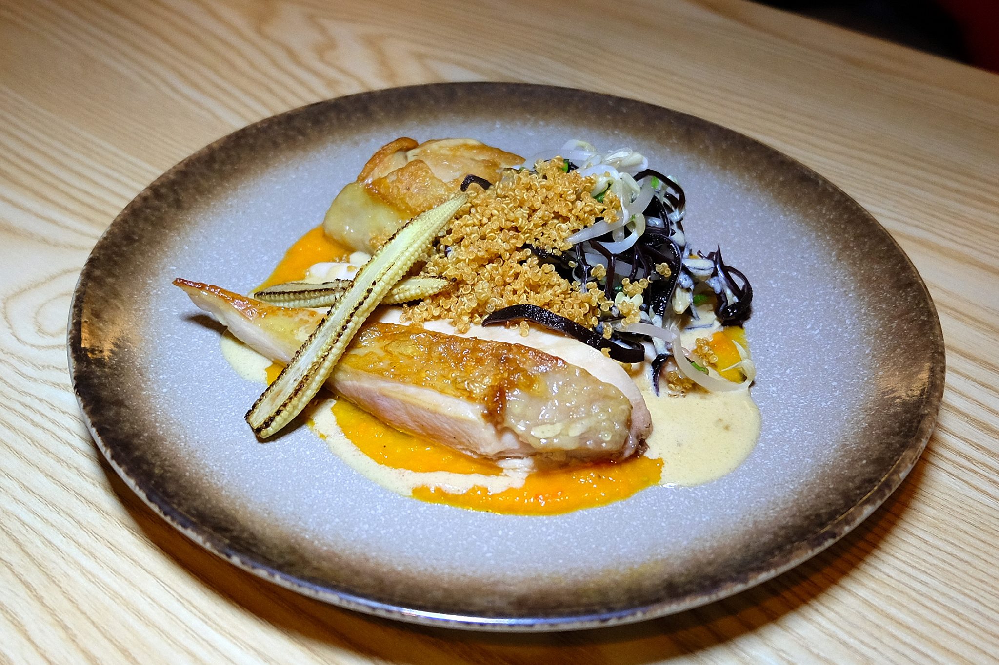 Slow roasted chicken with tomato jam, black fungi and beanshoot salad, fried quinoa, grilled baby corn, curry leaf infused buttermilk sauce. The chicken was surprisingly tender for a chicken breast! The curry butter sauce was simply lovely while the fried quinoa and baby corn gave some variance in texture. Somehow I wished I had some fried mantau buns to mop up the leftover butter sauce!