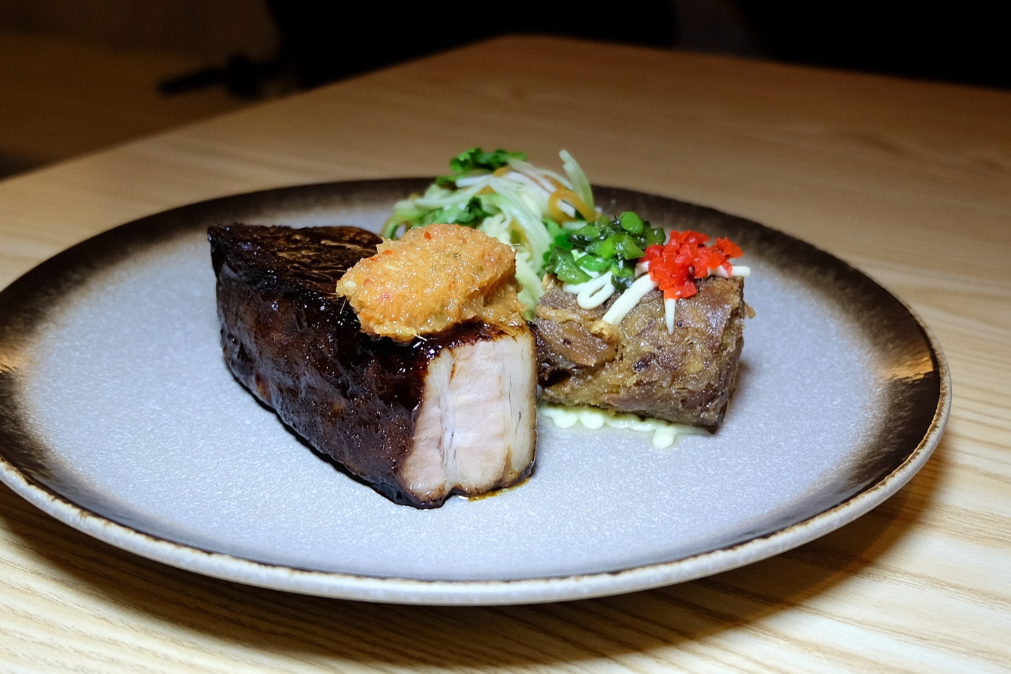 Braised char siew pork belly, crispy pork hock, nahm prik, pickled papaya and cucumber salad. Oh my!!!! A beautiful chuck of tender char siew! Honestly I didn’t really care about anything else on the plate besides the lovely char siew! Gorgeous and tender! This would put many char siew rice stalls to shame! A must-order for any char siew lover!