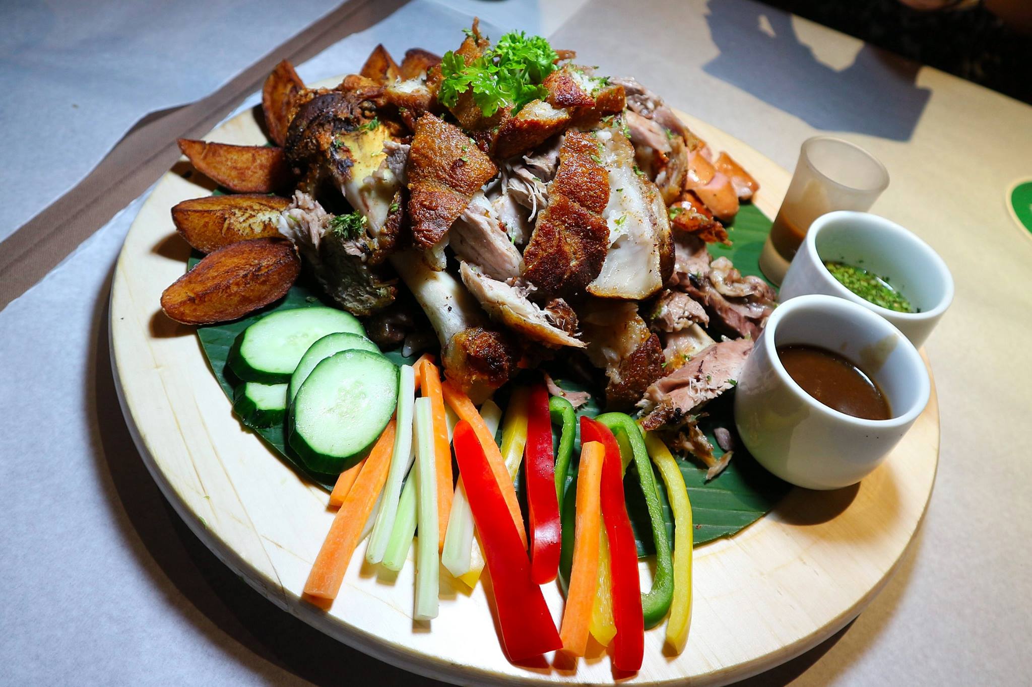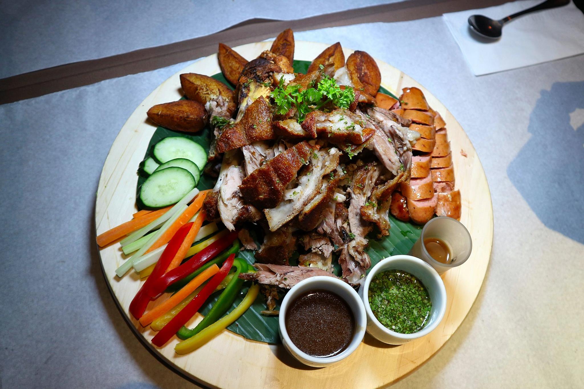 This dish was the star of the night and everyone dug in very enthusiastically! Aside from the crispy pork knuckle, this dish also came with sausages and potato wedges with a smattering of vegetables (perhaps to ease your conscience for eating so much meat) along with three (3) different sauces.