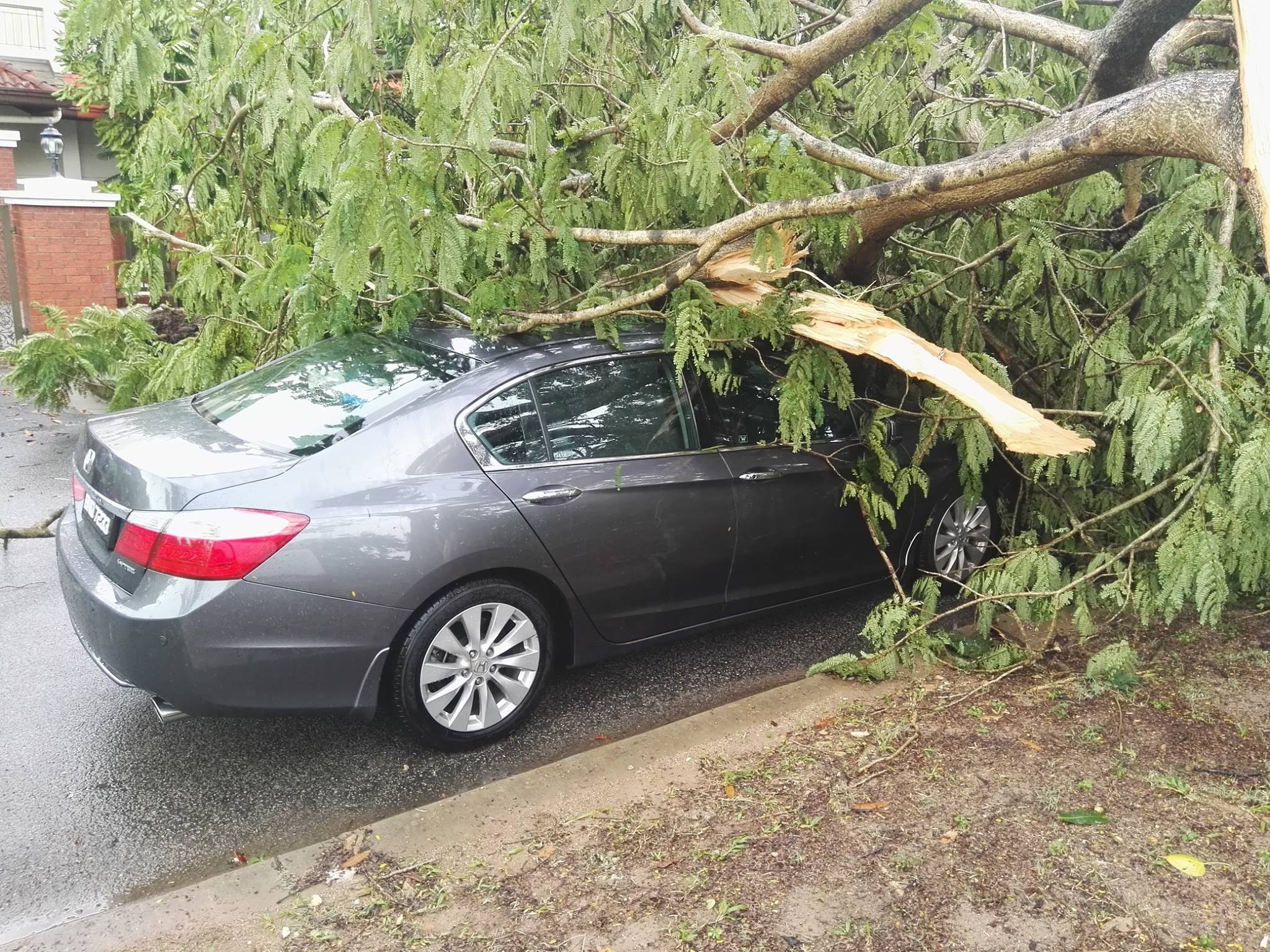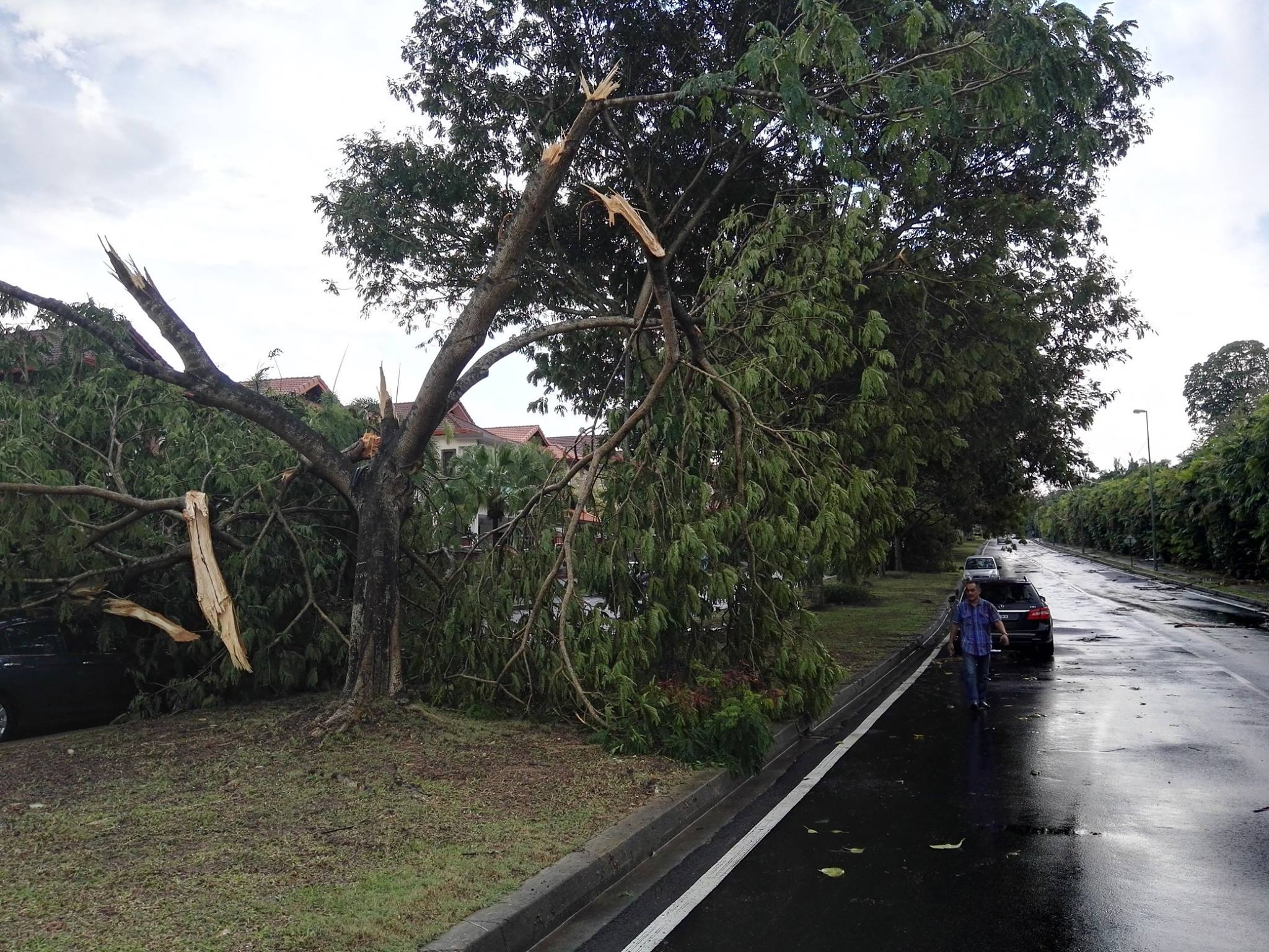The fire brigade suspected that a number of trees were downed by lightning strikes as there was charring on the bark of the trees. Unfortunately, Jalan TR 9/2 happens to have a good number of cars parked by the roadside and a number were damaged by the fallen trees and branches. The falling trees even caused a lamppost to fall blocking the entire road. Houses were not spared either as trees (yes trees!) and branches literally flew into houses damaging the properties.