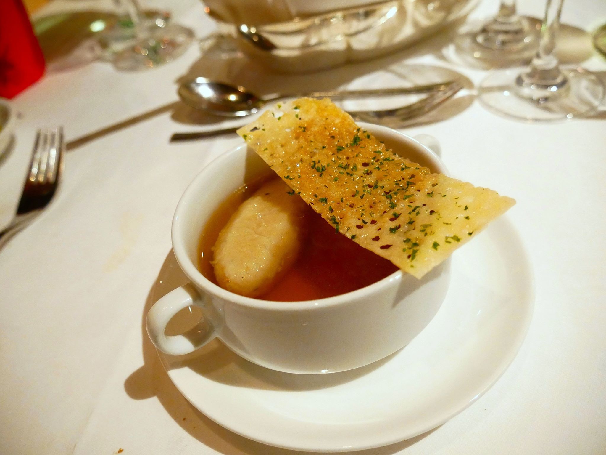 Royal Duck Consomme served with stuffed Gnocchi and Parmesan Crisp