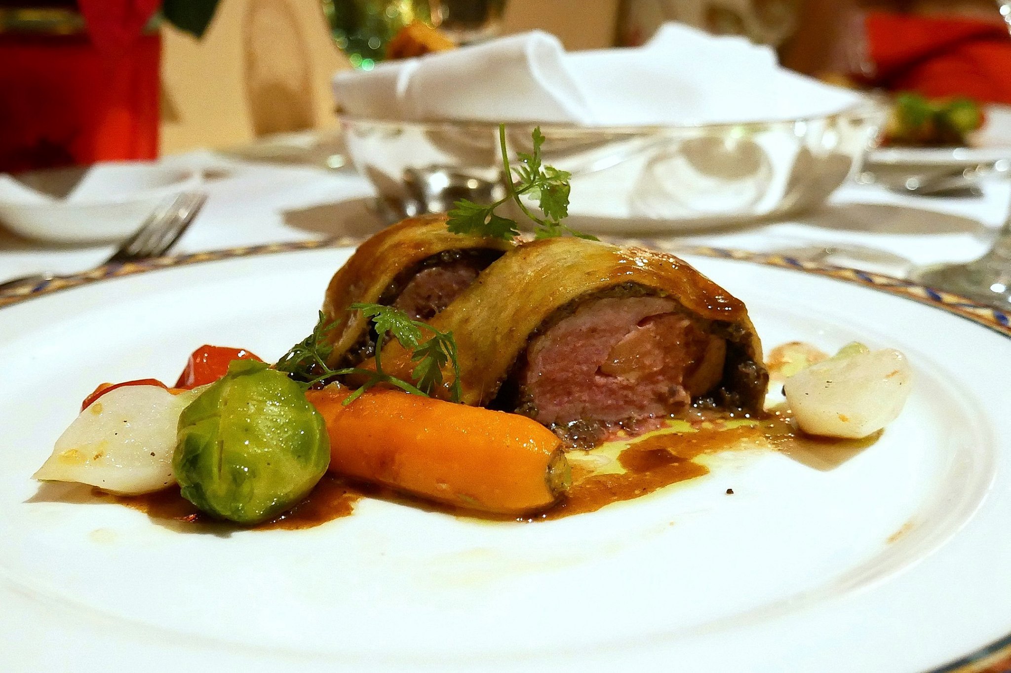 Christmas Lamb Loin filled with Foie Gras, baked in Puff Pastry, served with Brussel Sprouts and Morel Sauce