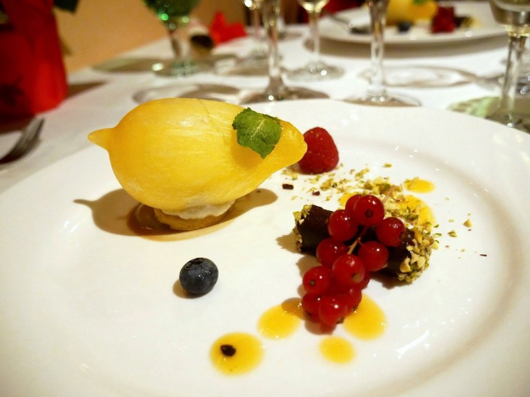 Lemon Tiramisu in Sugar Sphere, Passion Fruit Coulis with Chocolate Hazelnut Roll