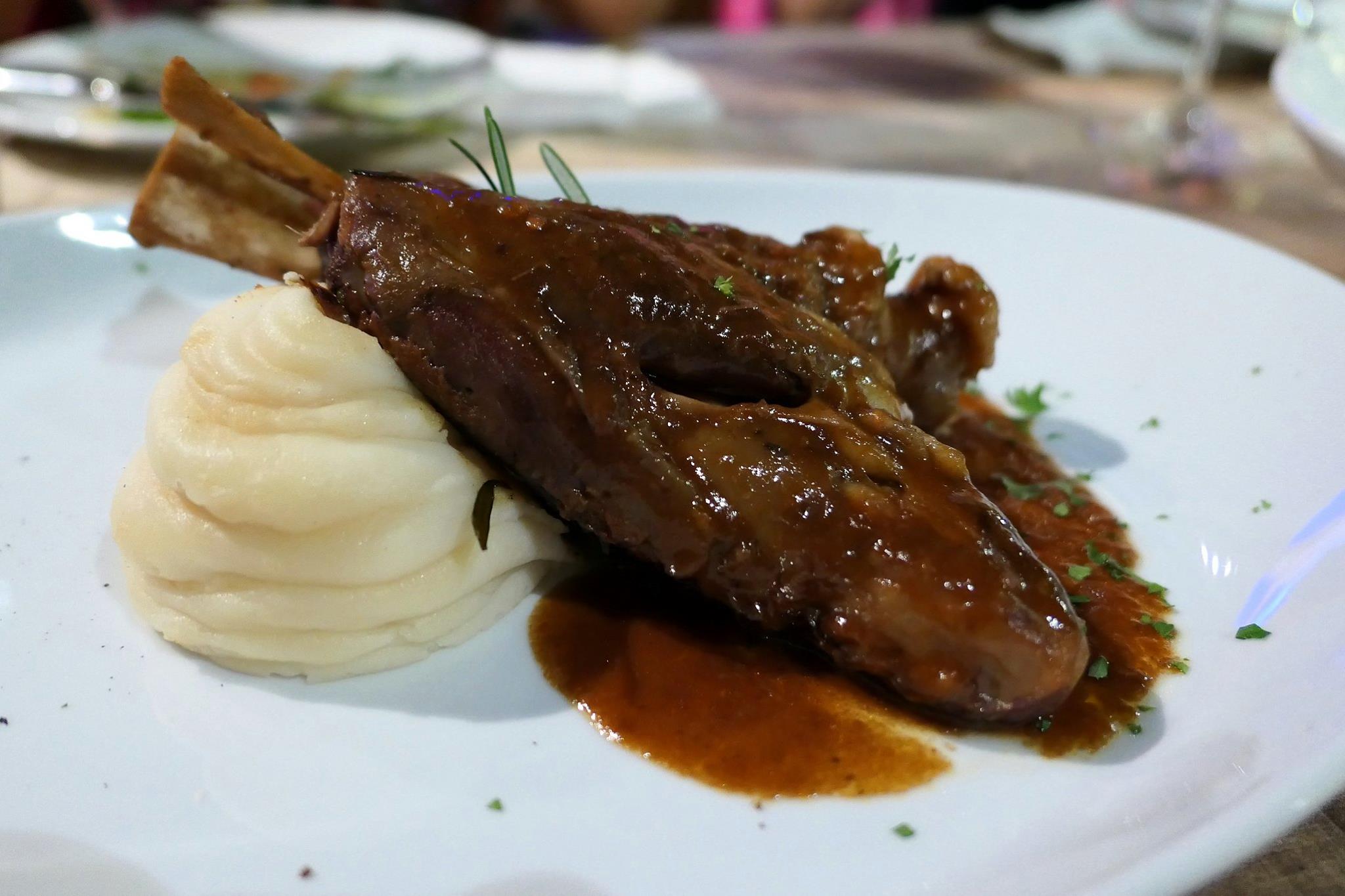 Oven baked lamb shank with herbs served with truffle mashed potatoes