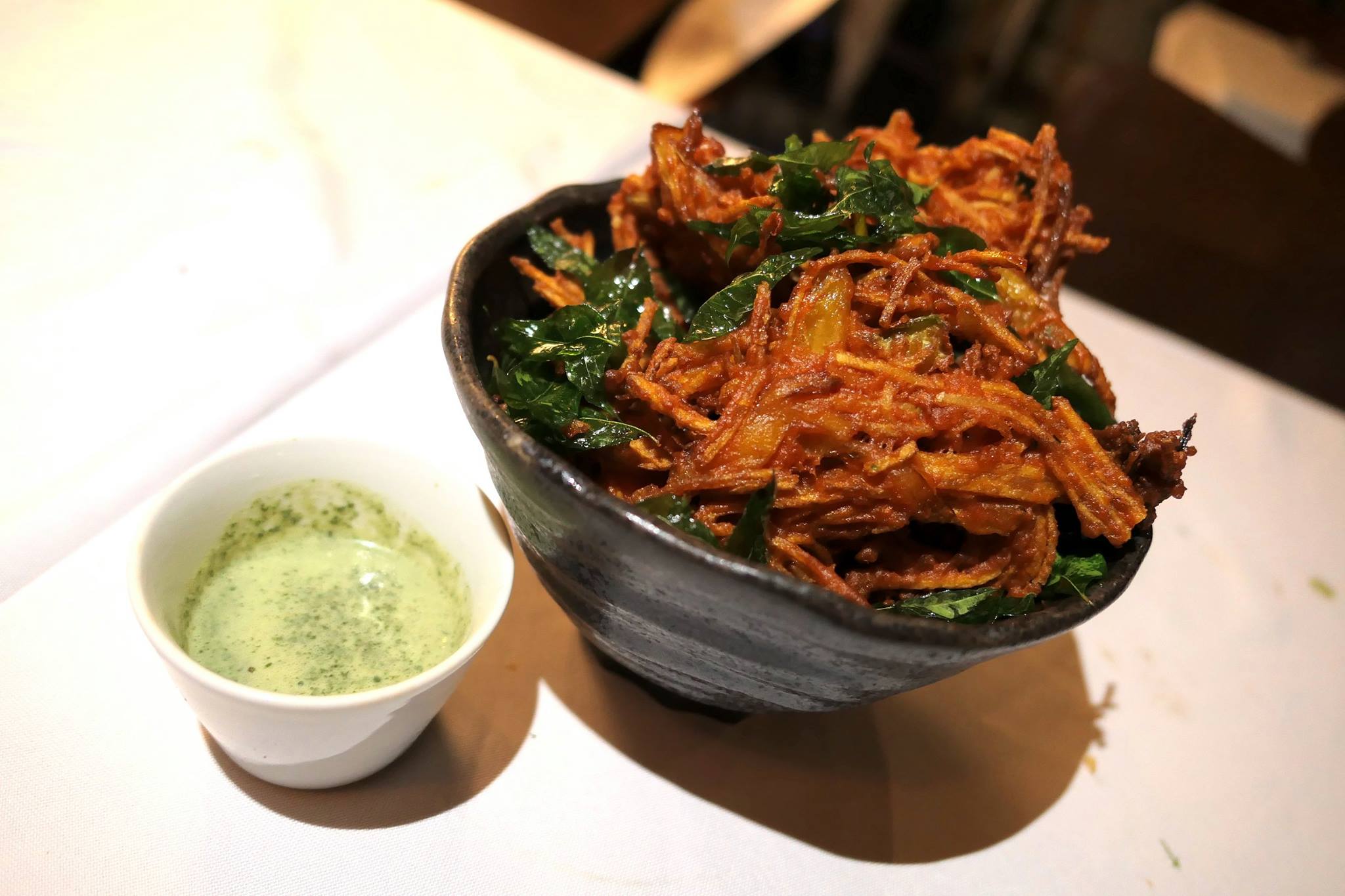 Thinly-sliced potatoes, bitter gourd, jackfruit and fresh chillies served with a mint yogurt dip