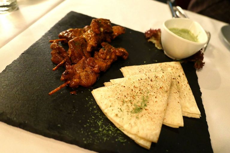 Tender pieces of lamb marinated Masala style grilled, skewed and served with mint sauce and flat bread