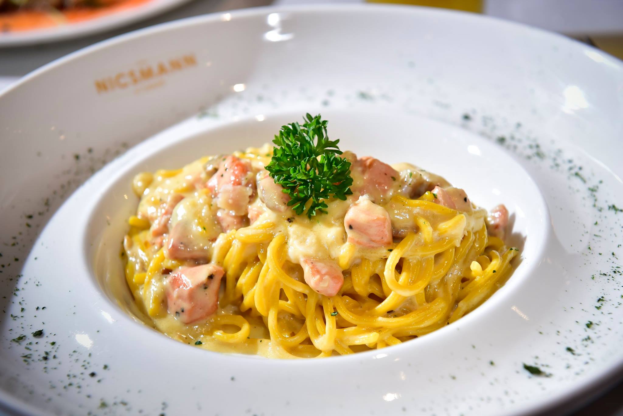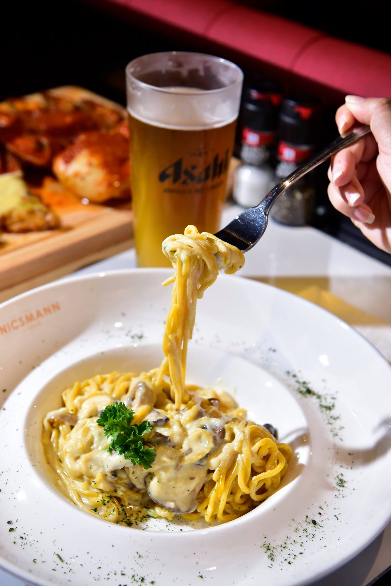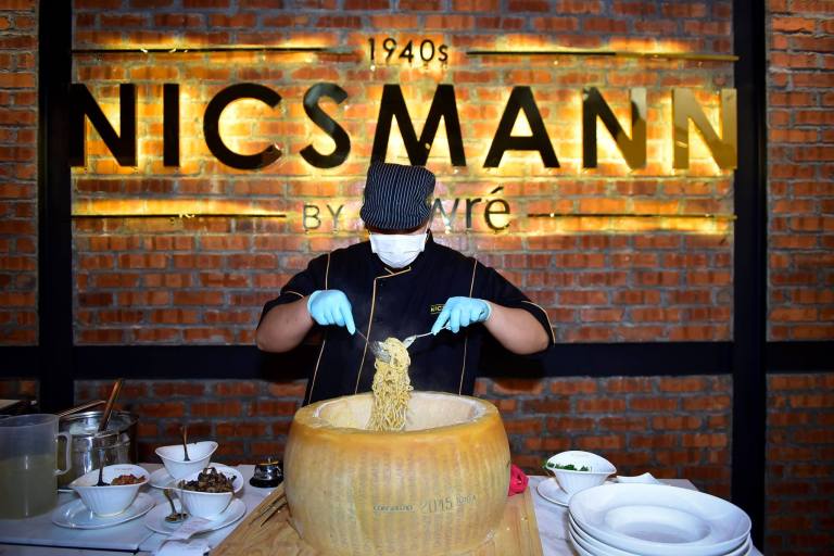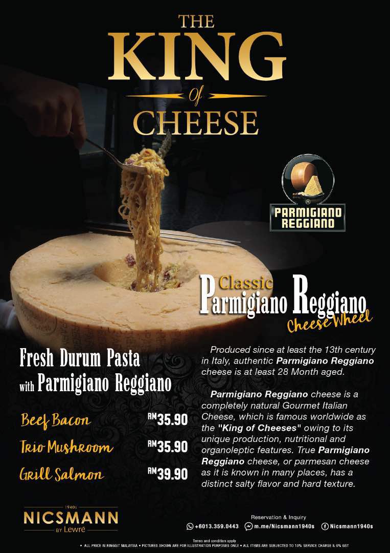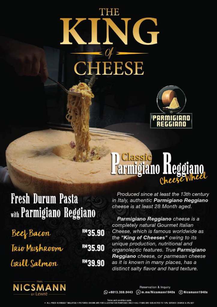The signature dishes at Nicsmann has to be the pasta which is tossed in the large Parmigiano-Reggiano cheese wheel! Parmigiano-Reggiano or Parmesan cheese, is a hard, granular cheese named after the producing areas, which comprise the provinces of Parma, Reggio Emilia, Bologna, Modena, and Mantua, Italy. Under Italian law, only cheese produced in these provinces may be labelled “Parmigiano-Reggiano”, and it has been called the “King of Cheeses”.
