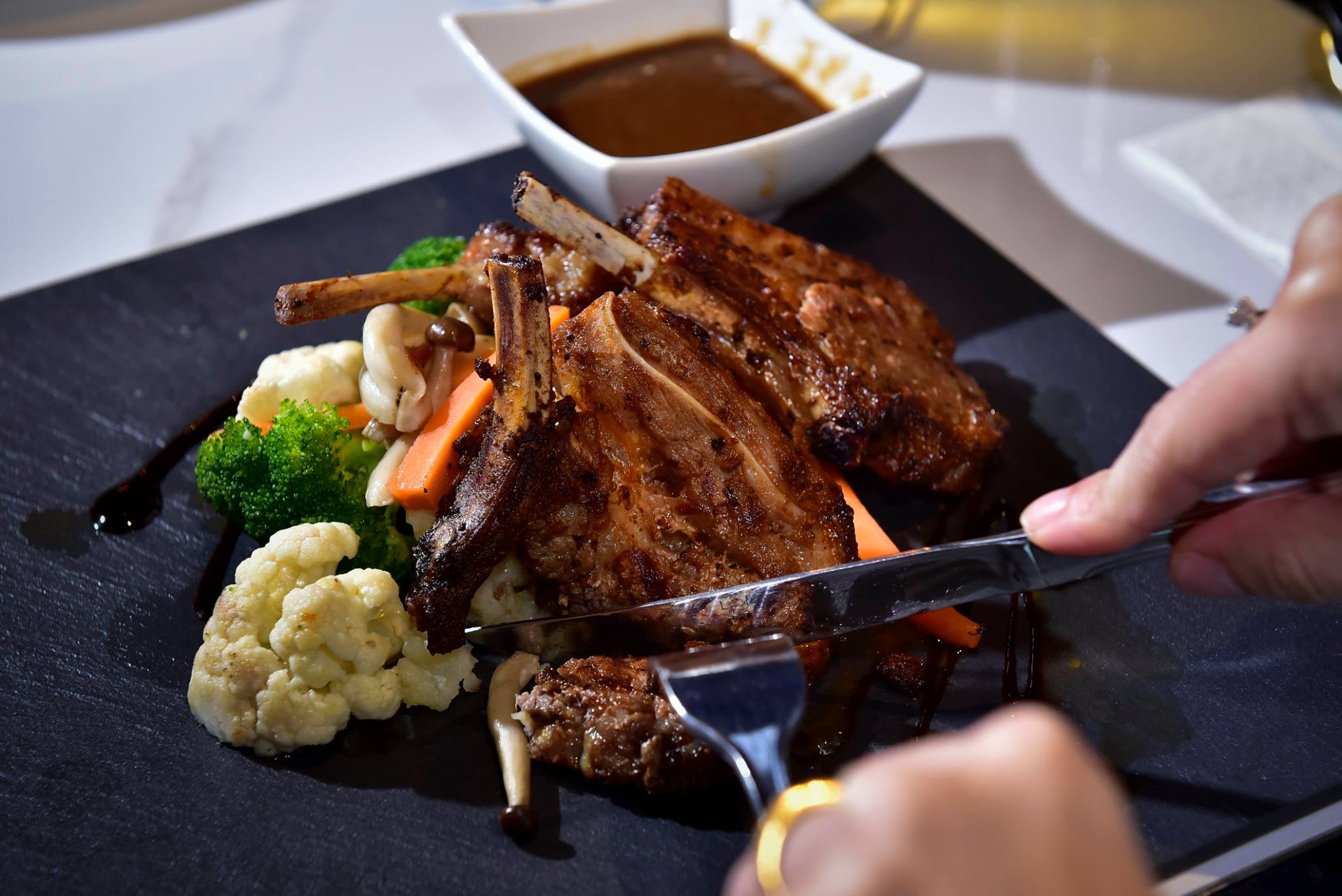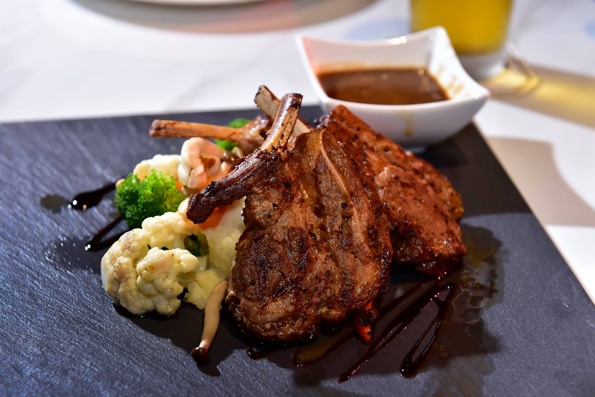 Grilled tender and flavourful cuts of lamb accompanied with a brown sauce and grilled vegetables.