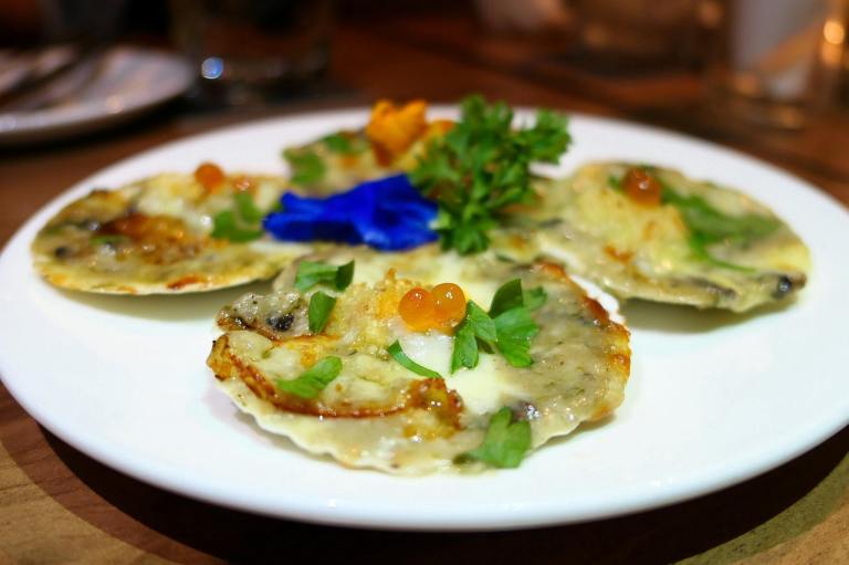 Juicy queen scallops baked with miso mushroom cheese sauce, tabasco, ikura, parsley