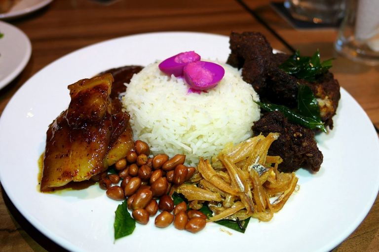 Deep fried pork ribs, caramelized gula Melaka pork belly, fragrant pandan coconut rice, spicy sambal, anchovies, peanuts, pickled quail egg, crispy shallots and kyuri
