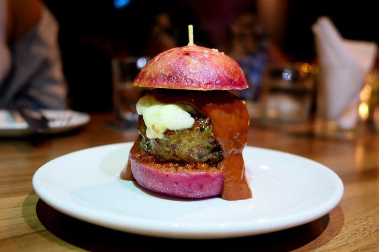 Pink brioche bun, grilled pork patty, strawberry pink peppercorn ketchup, kyuri, mozzarella, salsa