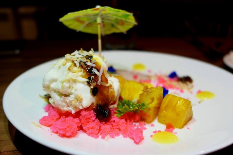Caramelized pineapple in gula Melaka, handcrafted toasted coconut ice-cream, mango gel, rose sponge, hibiscus preserve, passion fruit sauce