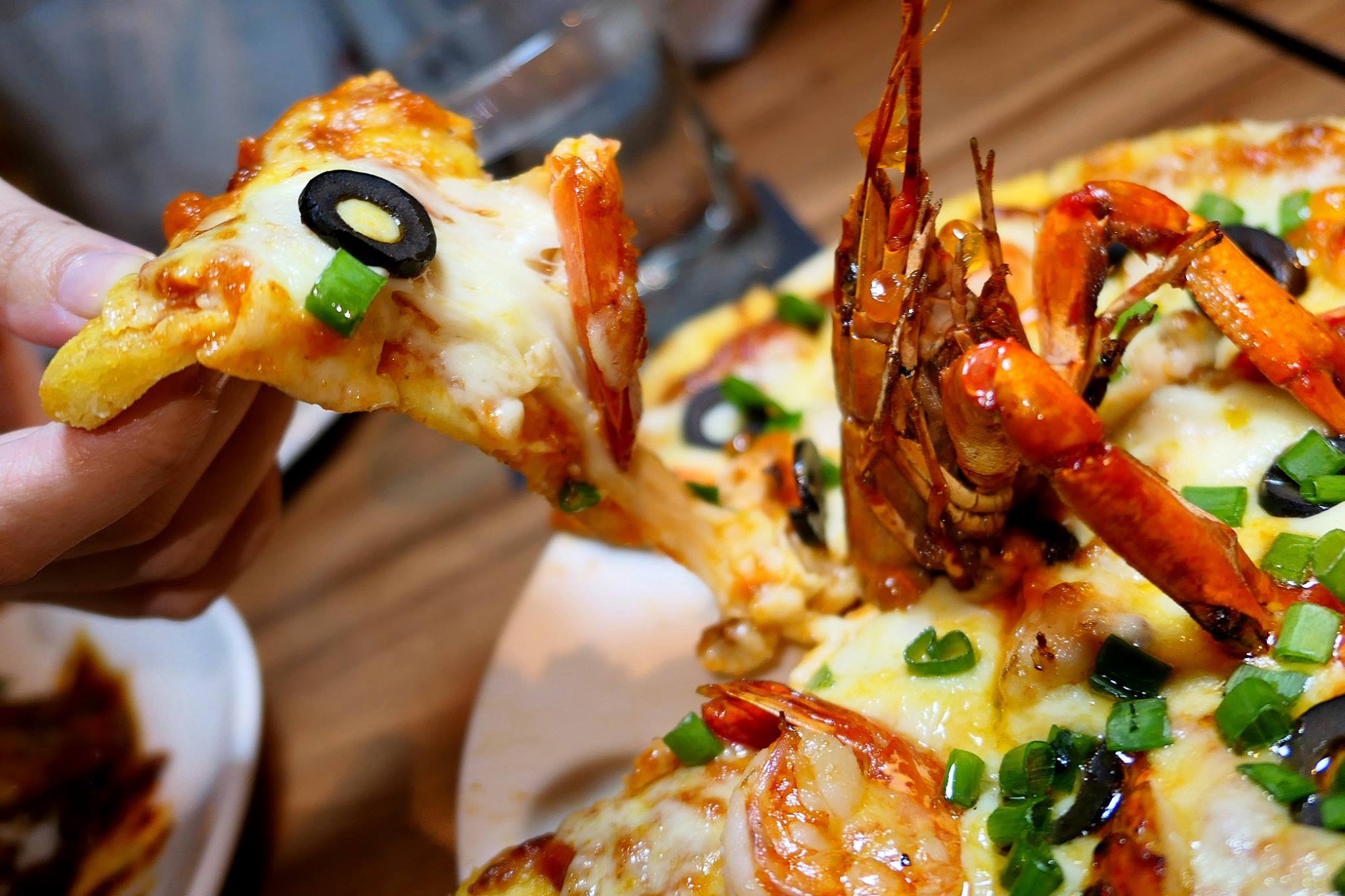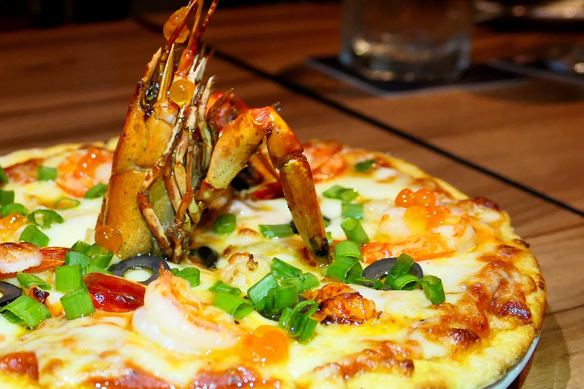Red pepper sauce, grilled tiger prawns, mini lobster, slipper lobster, ikura, mozzarella, cheddar, parmesan, black olives, prawn oil, spring onion