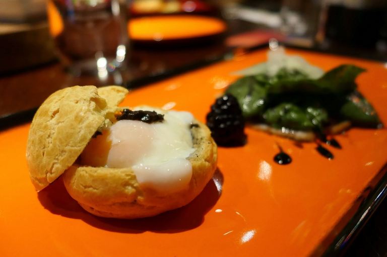 Profiterole Ripieni con Tartufi Uova, Spinachi e Anatra Affumicata