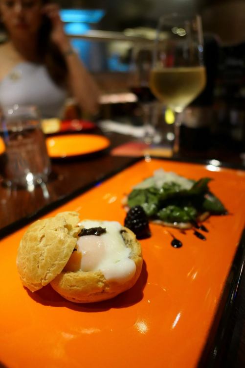 Profiteroles Filled with Smoked Duck, Truffle 65/65 Egg, and Baby Spinach