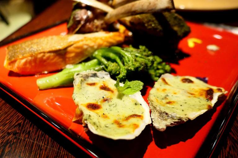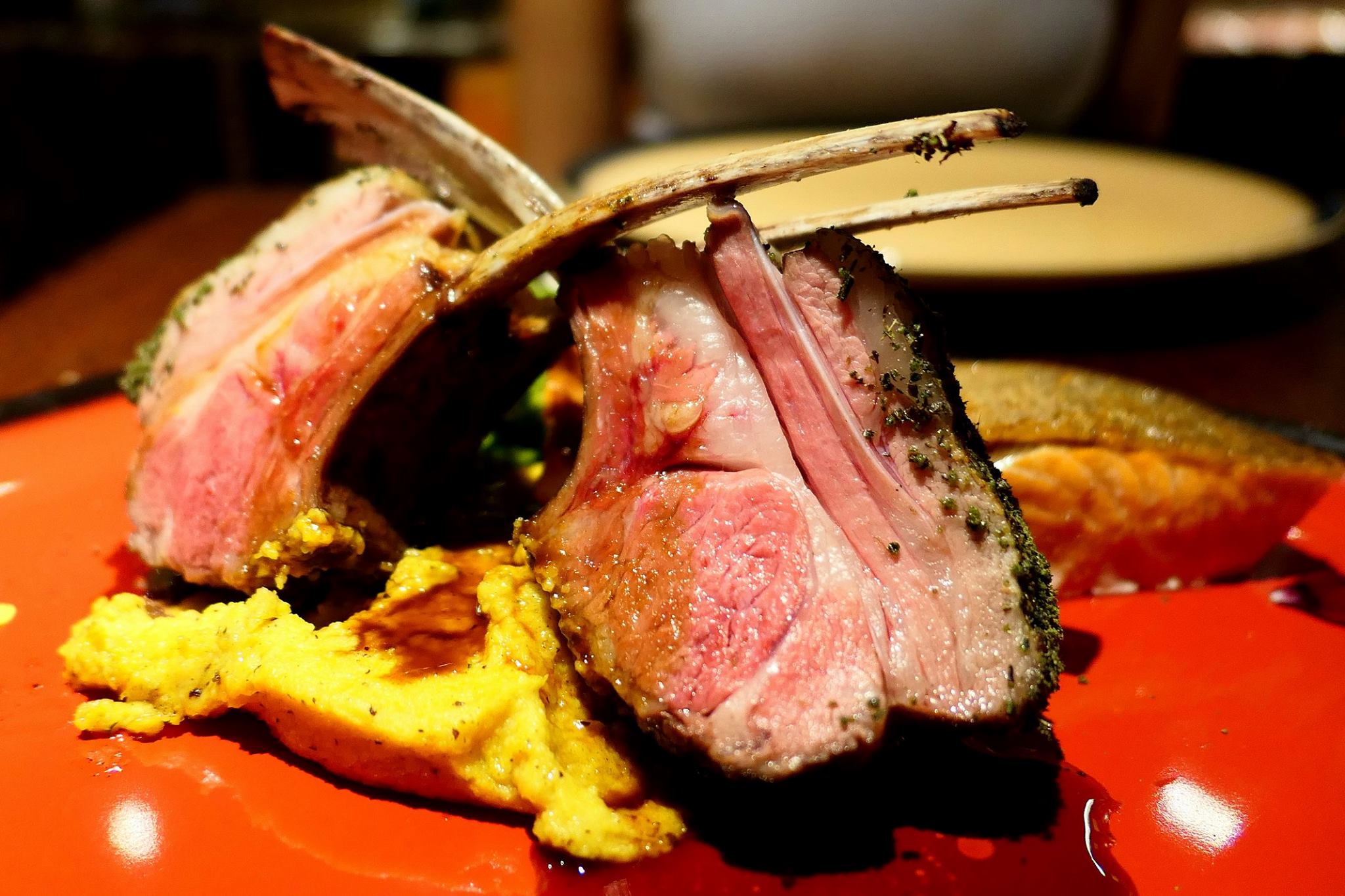 Grilled Lamb Rack on Pumpkin Polenta, Thyme Jus, Pink Salmon Trout with Mint Gratinated Oysters