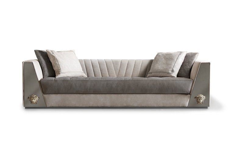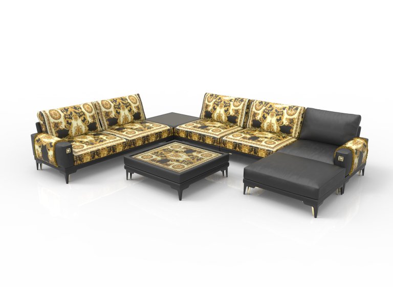 Barocco and texture are everything – the Versace Tribute 1 sofa epitomizes the very soul of Versace: Gianni Versace’s Fall Winter 1992 Barocco in velvet print is found on the leather sofas that give a rock’n’roll edge to the sectional sofa when paired with contrasting black leather and guilloché metal Medusa icons.