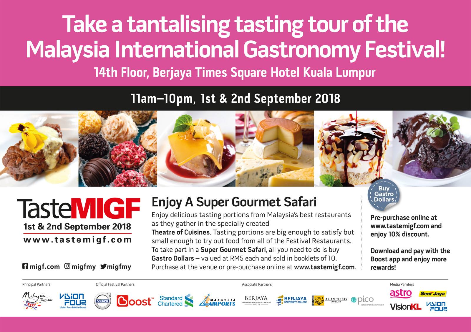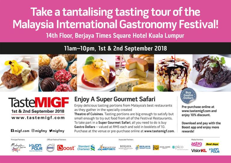 - Saturday & Sunday, 1st & 2nd September 2018 – 11.00 am to 10.00 pm ii. Payment Method: Boost E-Wallet or Gastro Dollars. Pre-buy Gastro Dollars at www.tastemigf.com