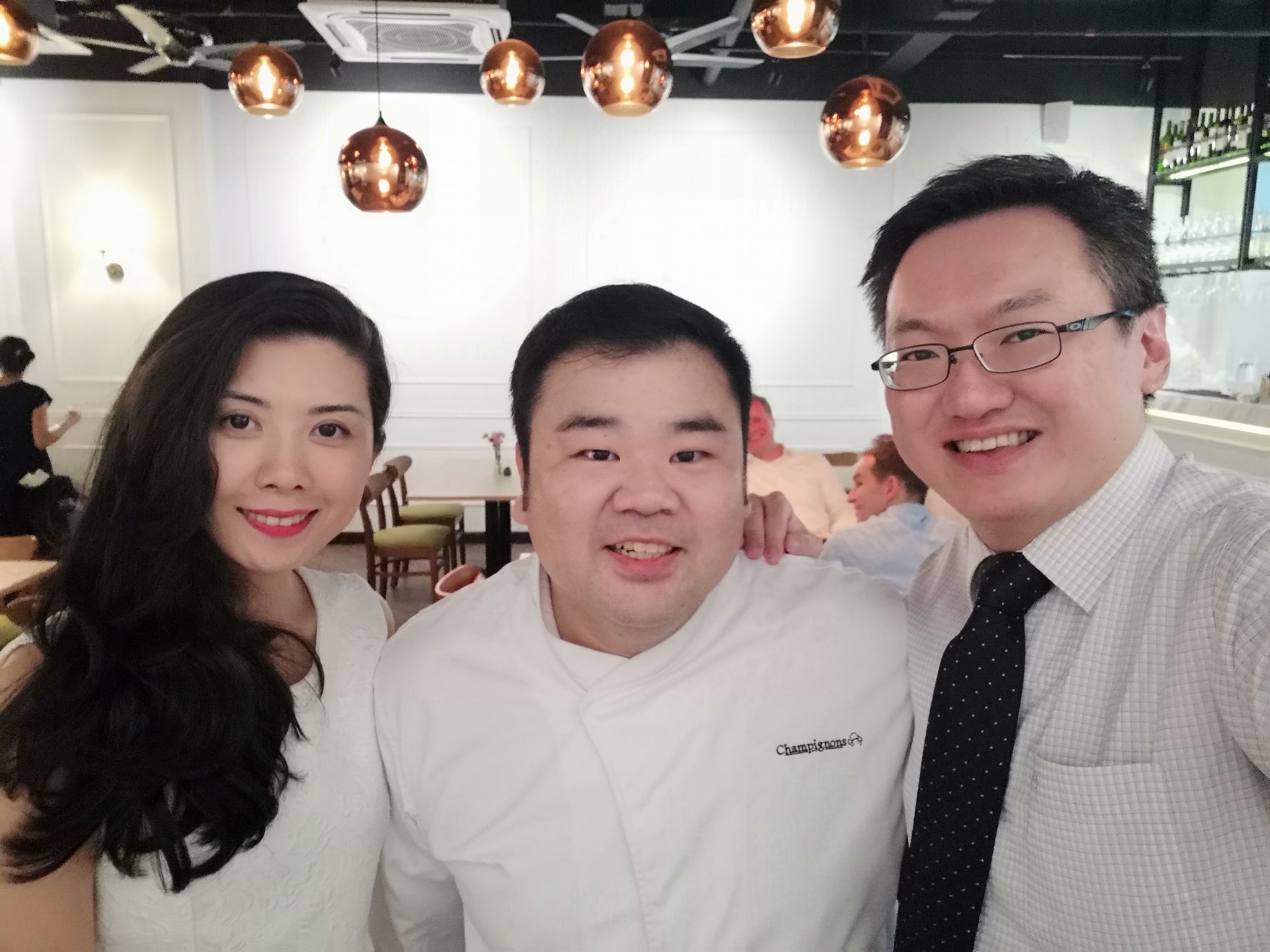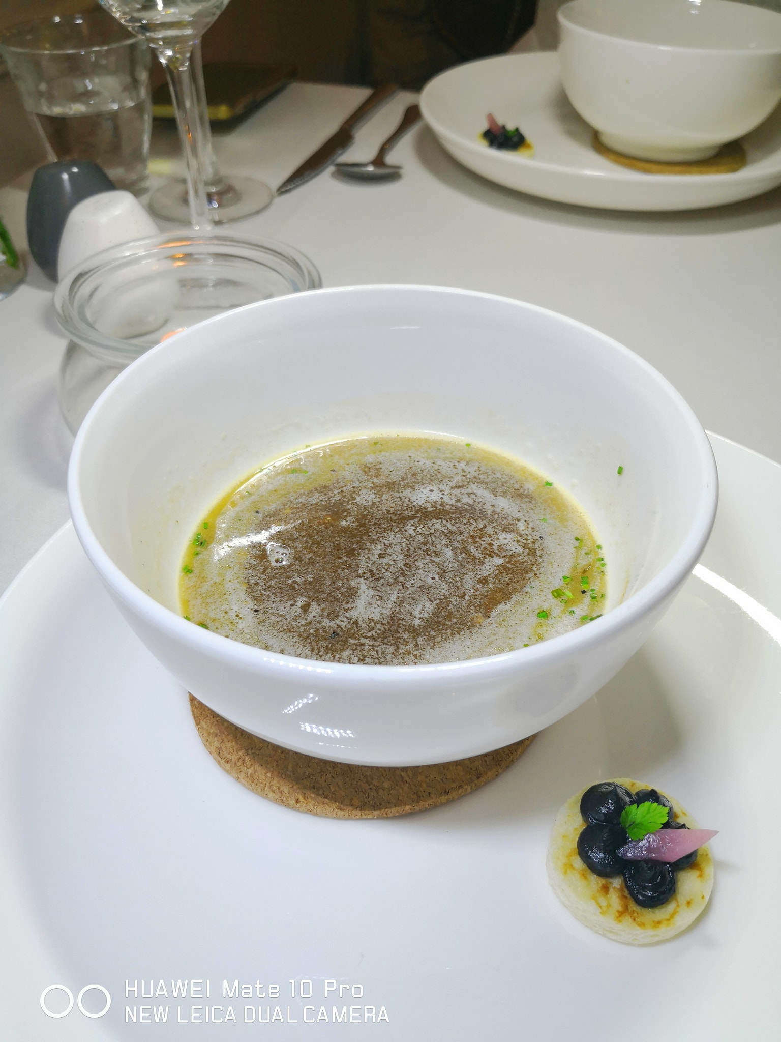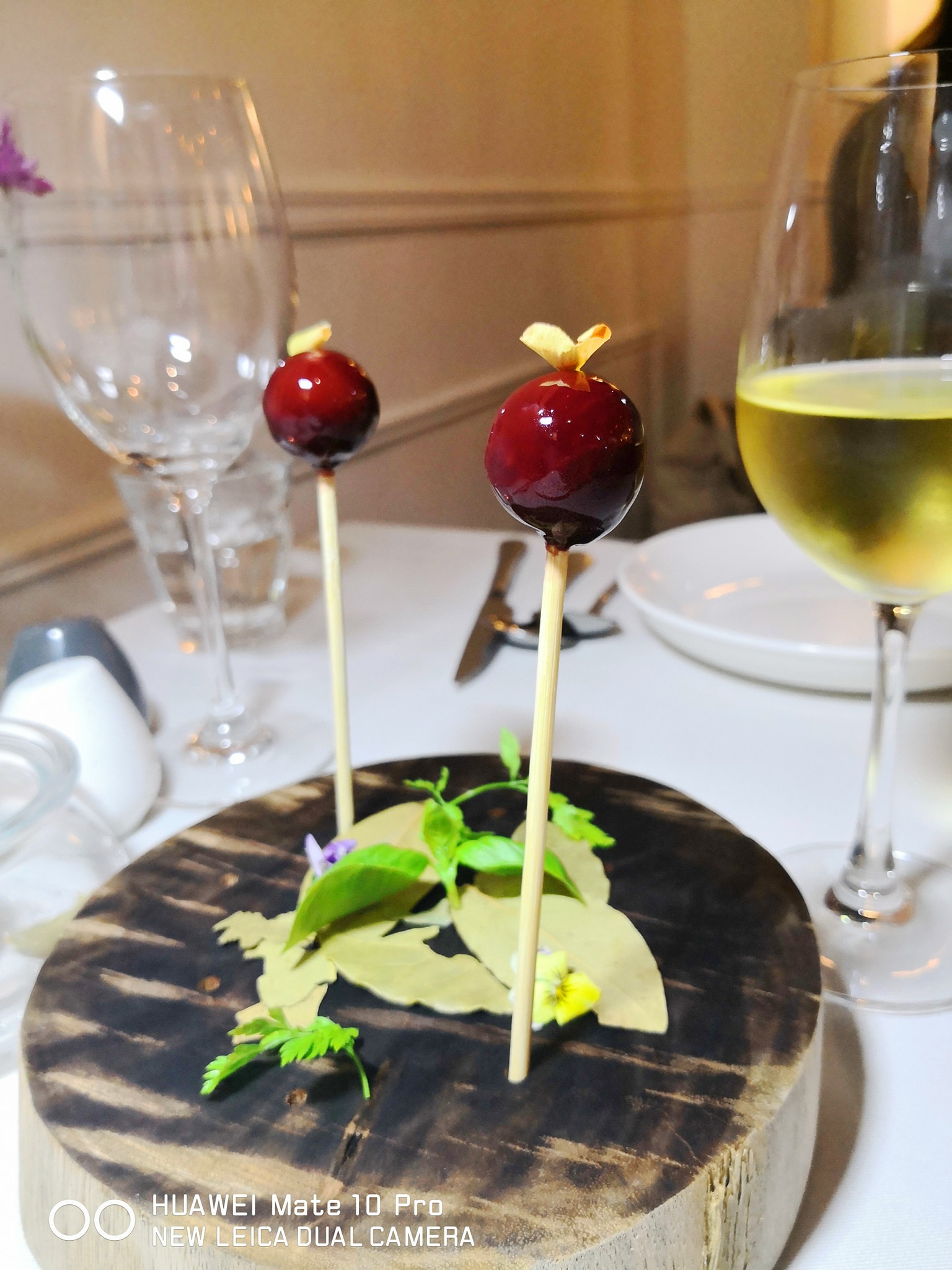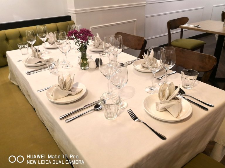 On the tables are fine white linen table cloths, with white cloth napkins, and proper cutlery and wine glasses, matching the white wooden wall panels. An Insta-friendly piece of driftwood with four mushrooms on it (champignons means mushrooms in French) hangs from on one of those walls.