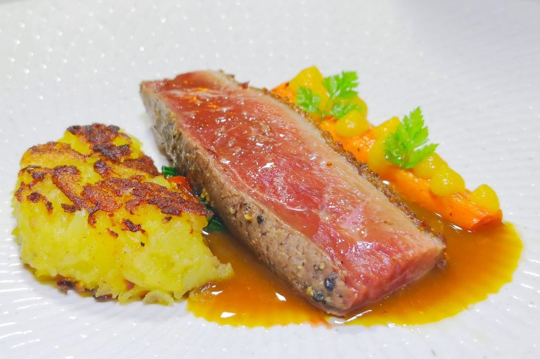 Roasted Carrot with Coriander, Rösti Potato and Orange Sauce