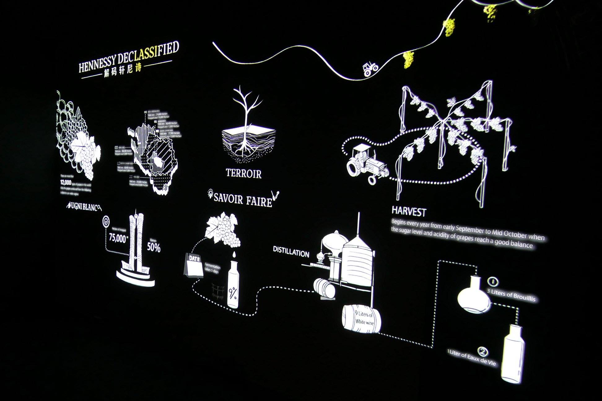 At the “Double Distillation” zone, we were taken to a thorough explanation of Hennessy’s distillation process of the eaux-de-vie during winter followed by an interactive “Infographic Wall”.