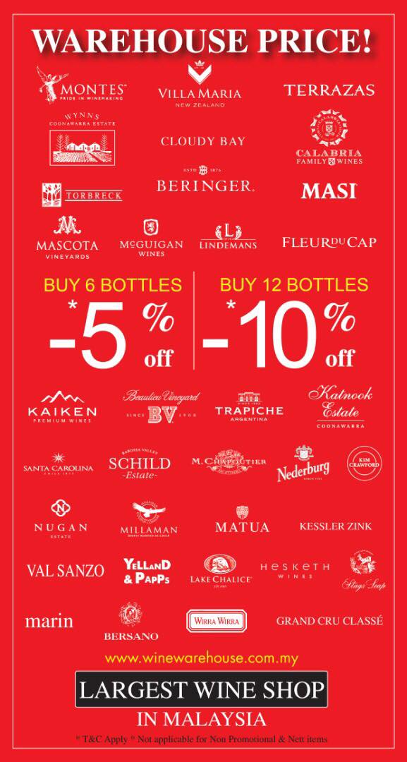 In line with their “Warehouse Concept”, walk in customers can enjoy a 5 % discount with six (6) bottles of wine purchased and 10% discount with purchase of 12 bottles or more.