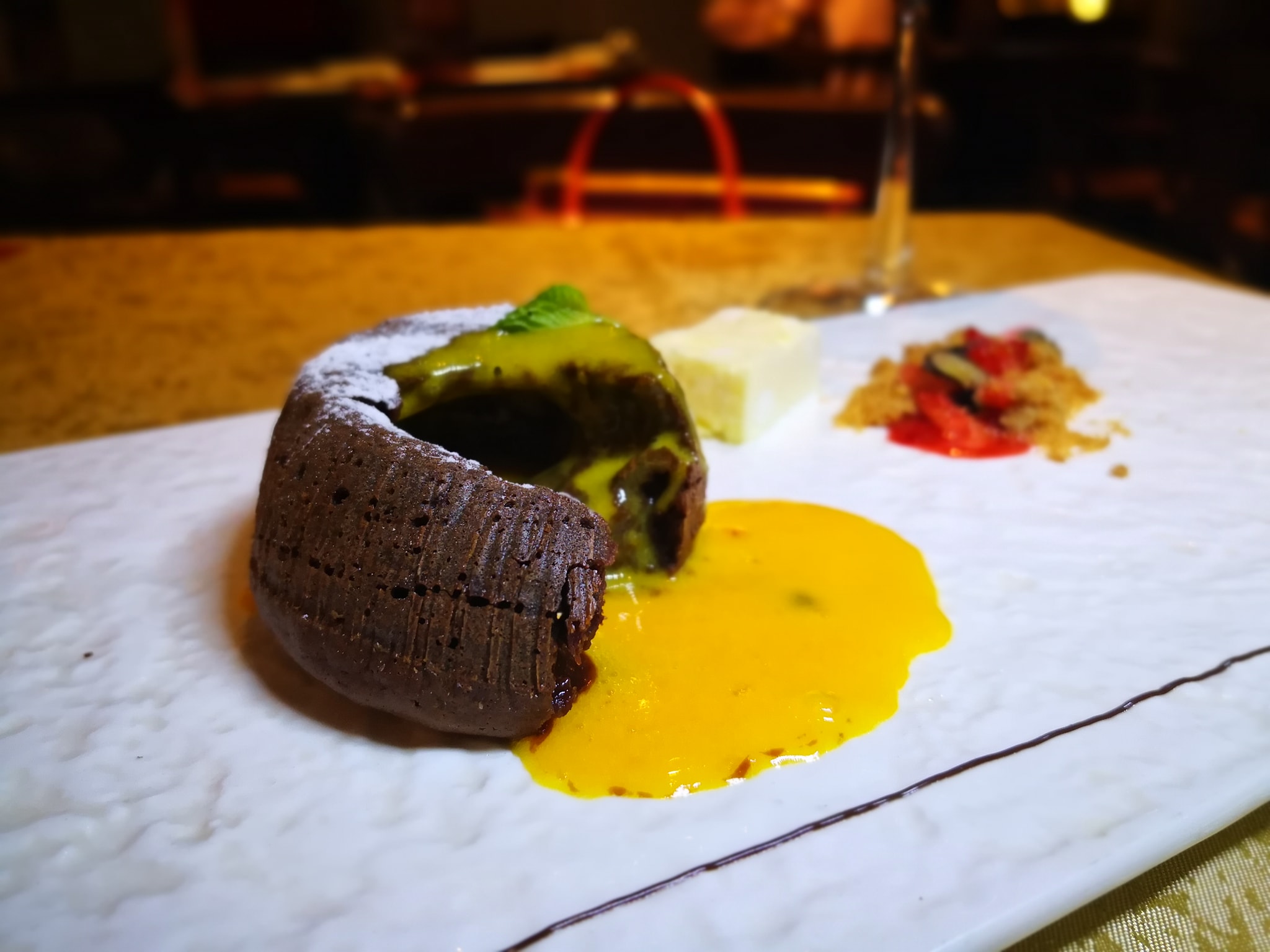 One word – DECADENT! A dark chocolate cake with a core of molten salted egg yolk “lava”. A very indulgent end to a hearty meal!