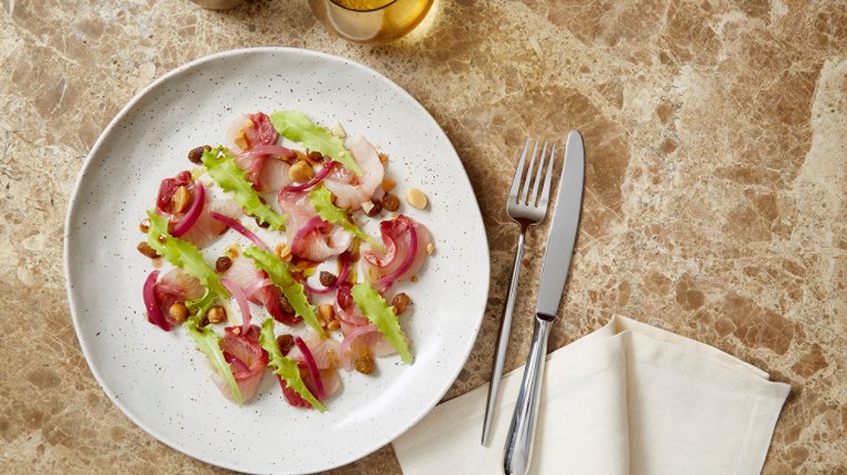 - Hiramasa kingfish sashimi, sweet and sour sauce, macadamia and pickled onion