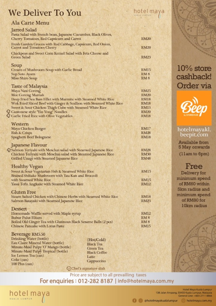 The a la carte menu is available from 5 May 2020 onwards. Orders can be made via Storehub or hotelmayakl.beepit.com