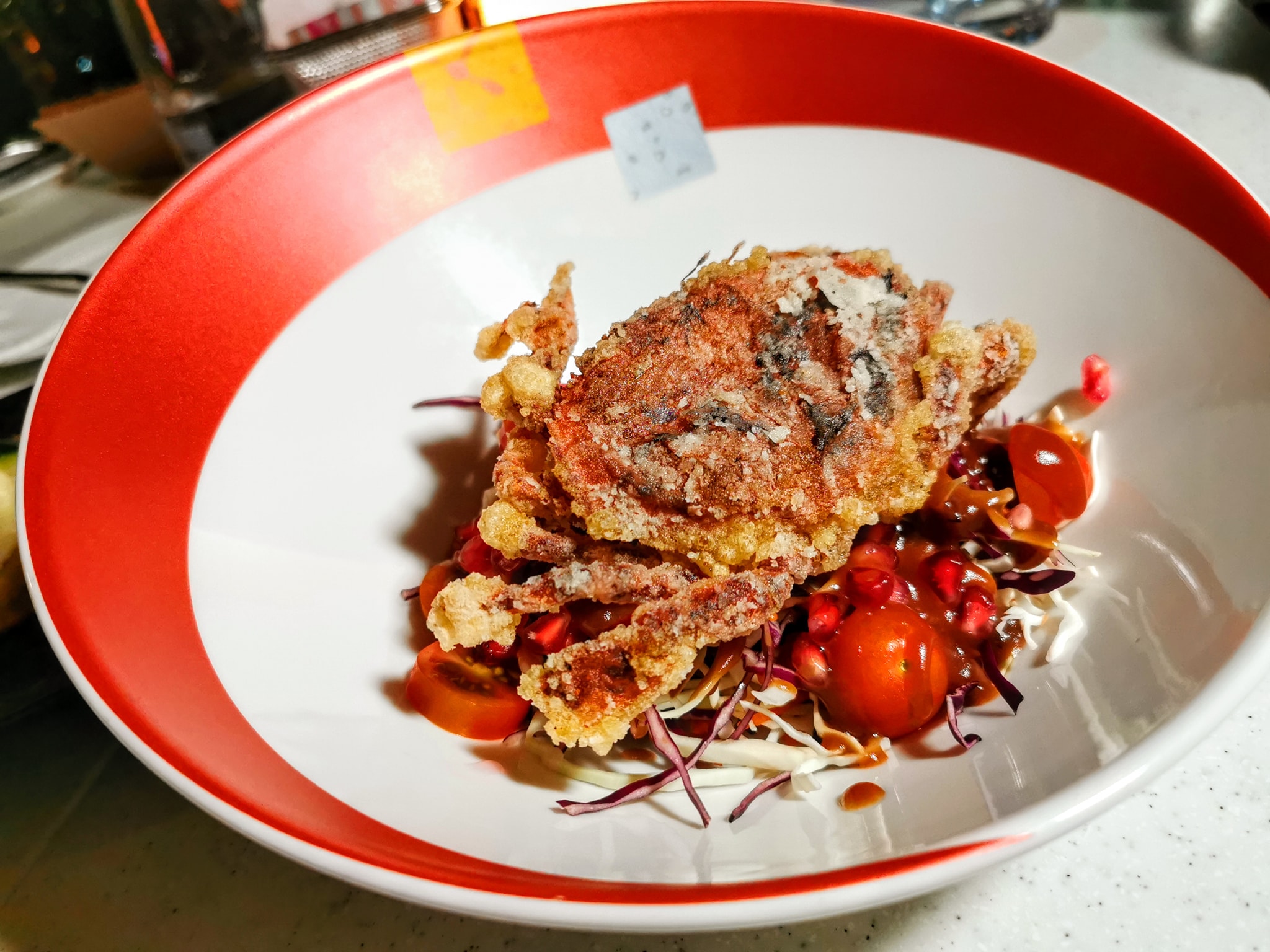 Tempura soft shell crab with Asian slaw, pomegranate, Sekinchan coconut oil vinaigrette