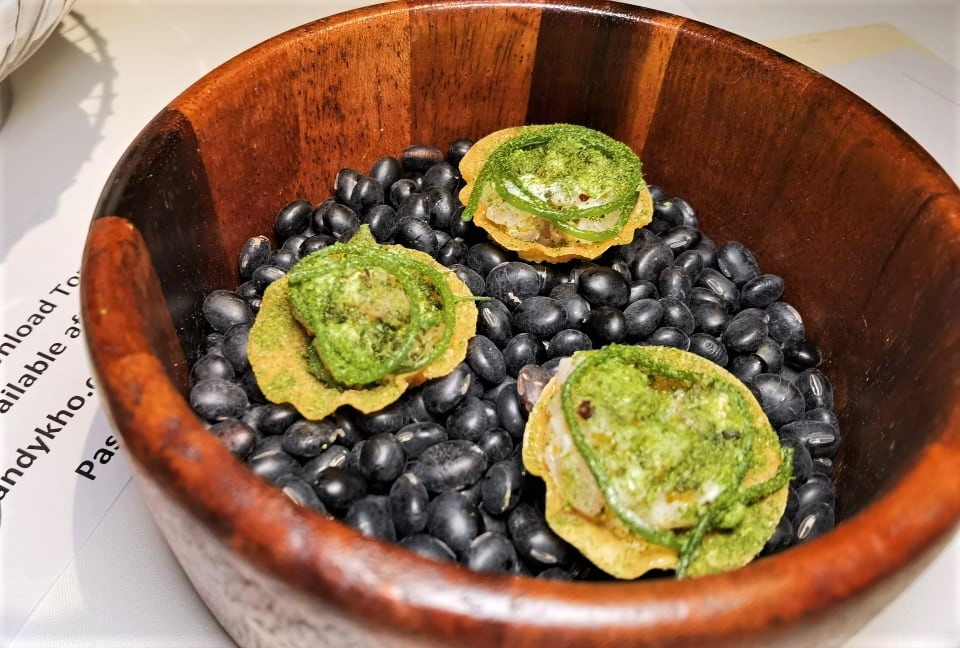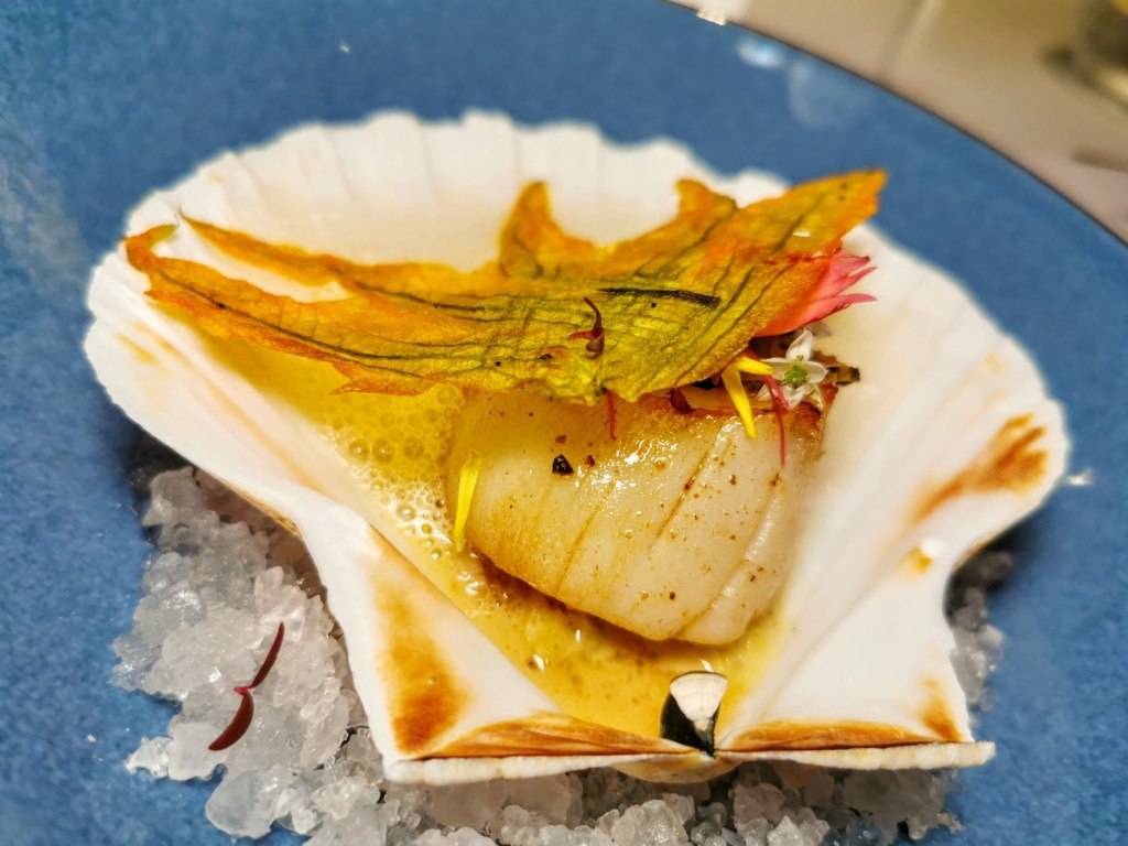 The Kuheiji Junmai Daiginjo ‘Betsuatsurae’ has aromas of Andean melon, pear and apple skin, with a faint scent of lychee, leaves and cypress. On the palate, we got the sweetness of white chocolate with a slight astringency like the white part of mandarin orange peel. This elegant sake is creamy and rich, matching beautifully with the scallops.